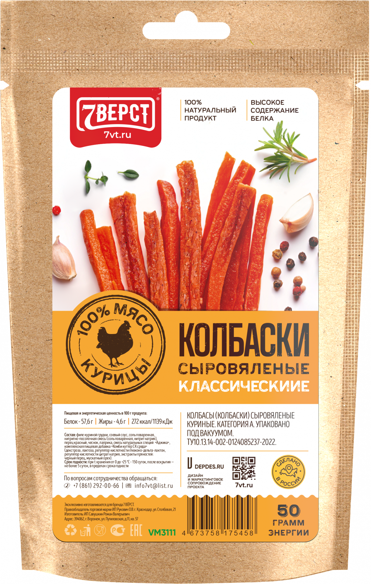 Филе куриной грудки, соевый соус; соль поваренная, нитритно-посолочная смесь; перец красная чеснок, паприка; смесь натуральных специй «Аджика»; комплексная пищевая добавка «Комби куттер СК среда».