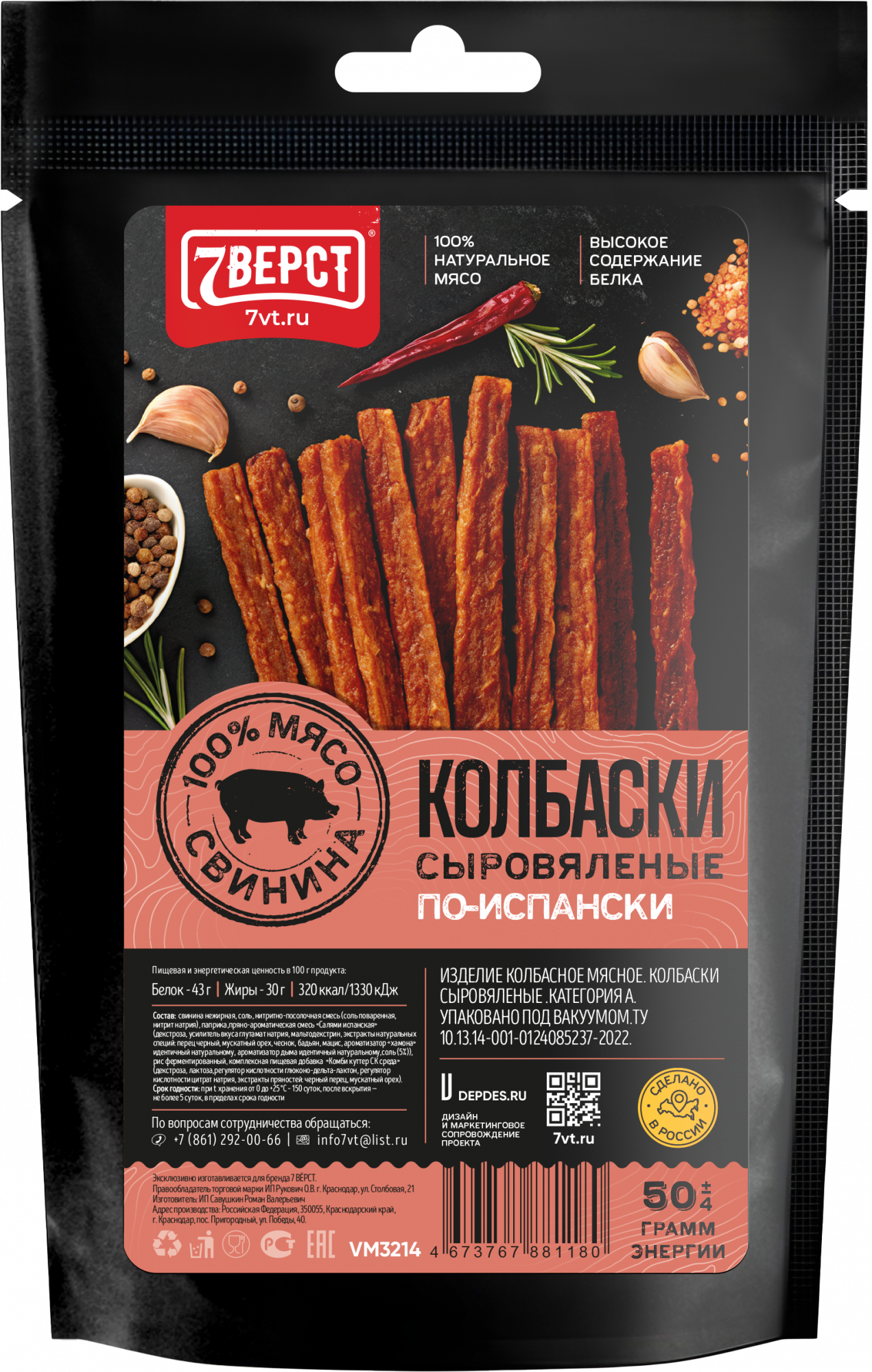 свинина нежирная, соль, нитритно-посолочная смесь (соль поваренная, нитрит натрия), паприка, пряно-ароматическая смесь «Салями испанская», рис ферментированный, комплексная пищевая добавка «Комби куттер СК среда».