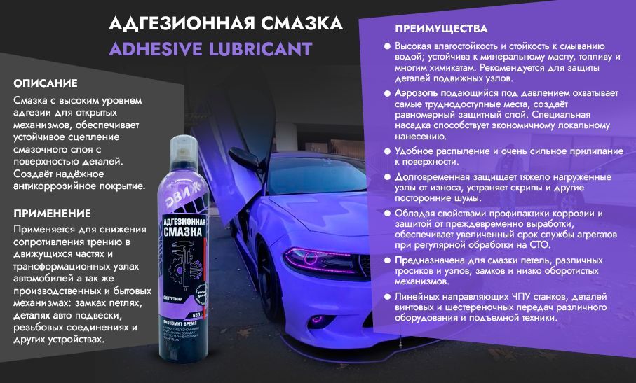 ДВИЖ Адгезионная смазка, аэрозольный баллон 650 мл. Смазка с высоким уровнем адгезии для открытых механизмов, обеспечивает устойчивое сцепление смазовочного слоя с поверхностью деталей.
