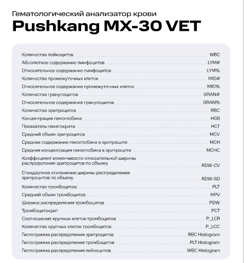 - Трехкомпонентный ветеринарный гематологический анализатор Pushkang MX30VETпредназначен для проведения общего анализа крови (ОАК) у животных.