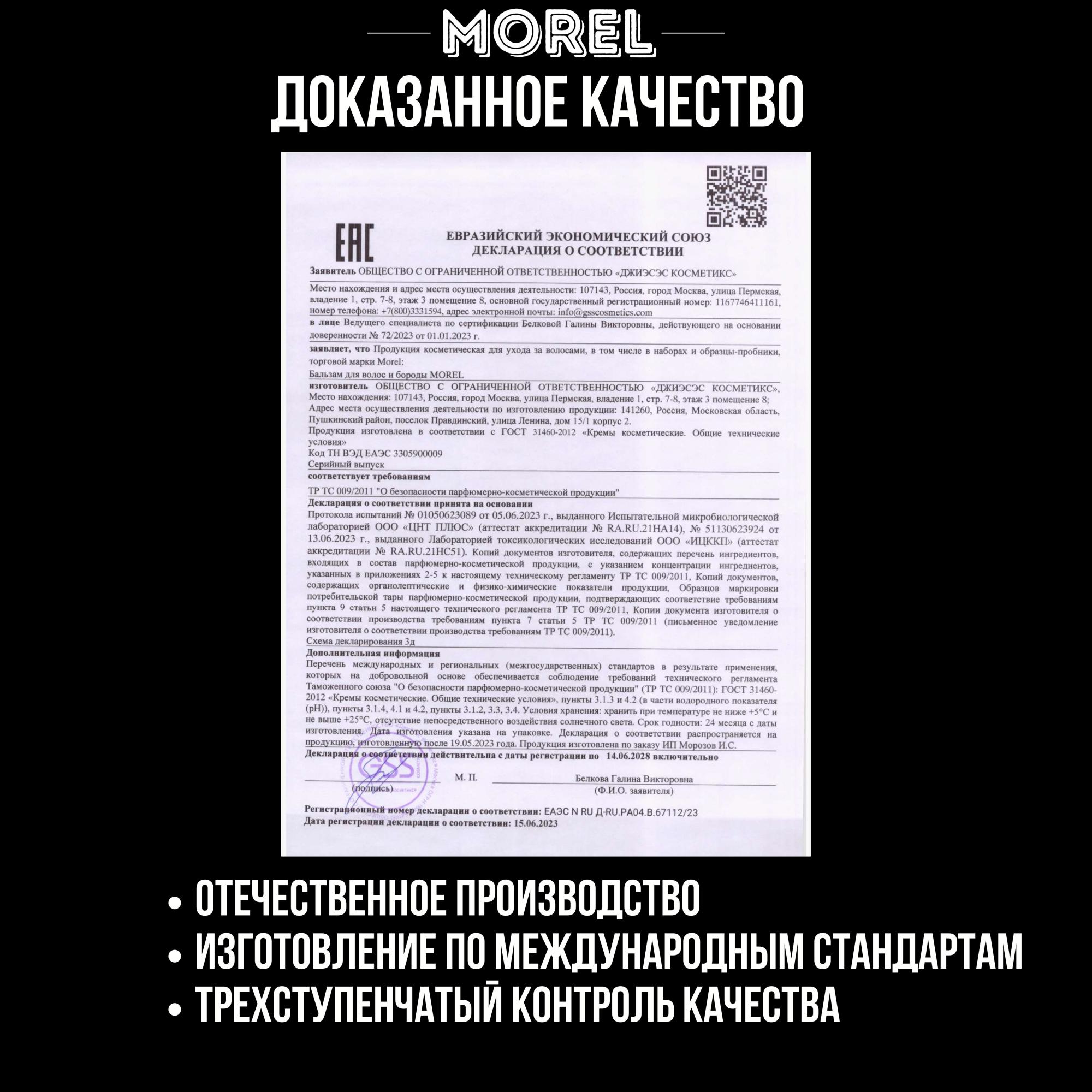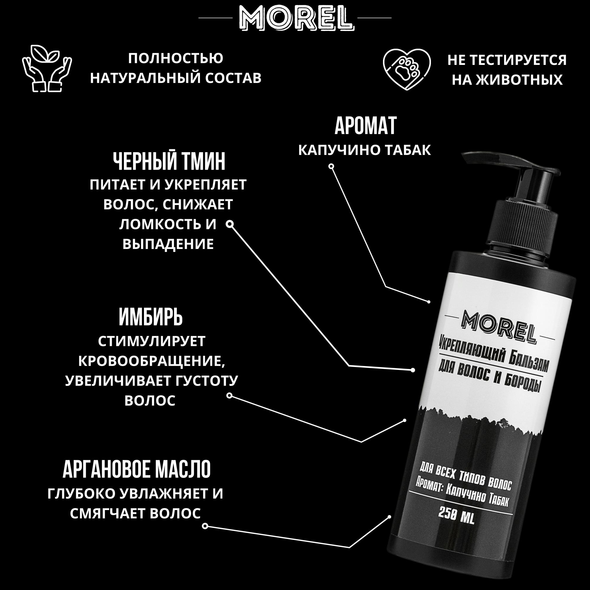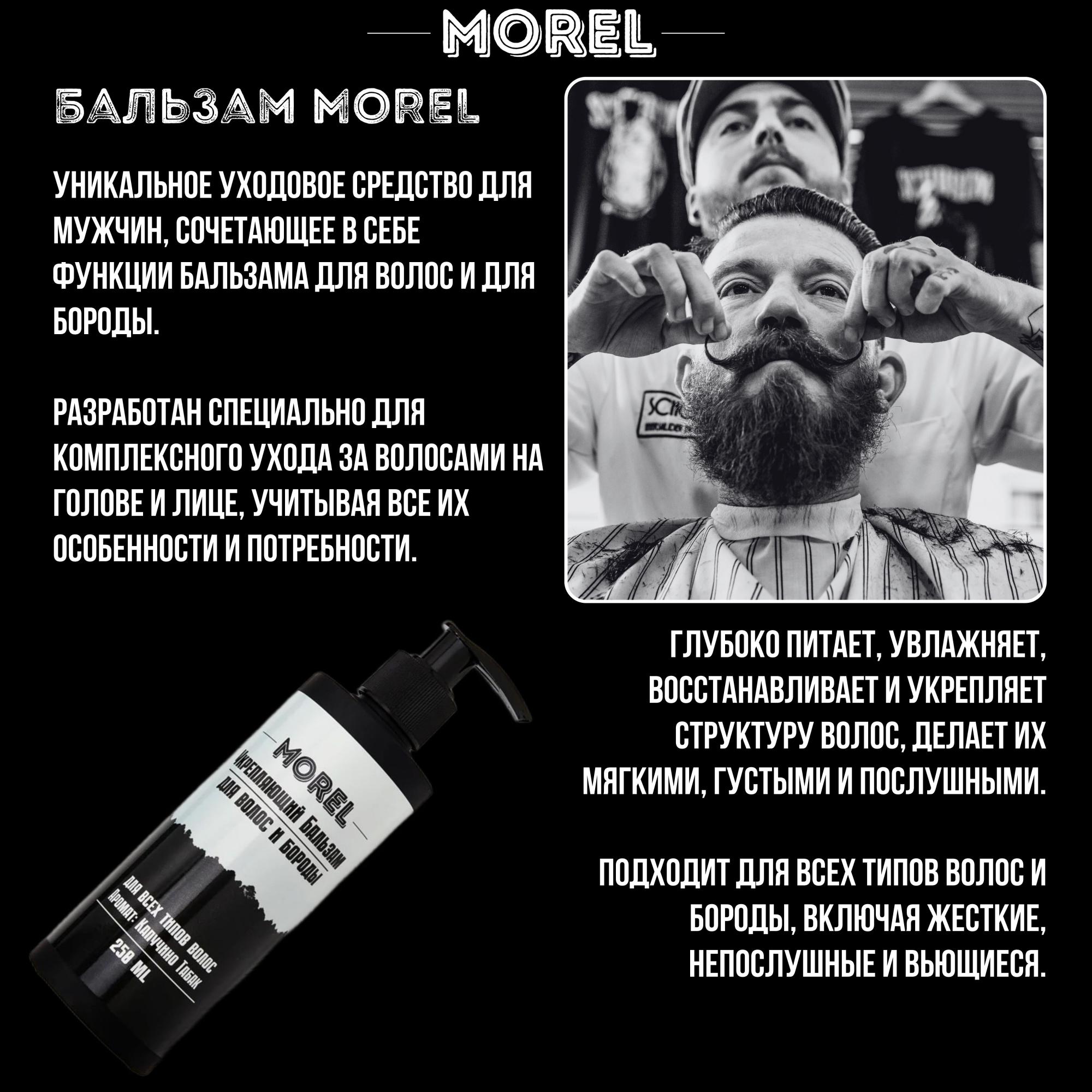 Бальзам для бороды и волос MOREL - это уникальное уходовое средство для мужчин, сочетающее в себе функции средства для волос и для бороды. Он разработан специально для комплексного ухода за волосами на голове и волосами на лице, учитывая все их особенности и потребности. Преимущества бальзама MOREL: Натуральные компоненты. Содержит только натуральные ингредиенты, которые не вызывают аллергических реакций и подходят для чувствительной кожи. Универсальность применения. Подходит для любых типов волос и бороды и усов, включая жесткие, непослушные и вьющиеся волосы. Эффективный уход. Глубоко питает, увлажняет и восстанавливает структуру волос, делает их мягкими, блестящими и послушными. Защита от внешних факторов. Создает на бороде и волосах защитную пленку, которая защищает волосы от воздействия ультрафиолета, низких температур и других неблагоприятных факторов. Удобство использования. Для укладки бороды средство имеет легкую текстуру и приятный аромат, благодаря чему легко распределяется по волосам. Уход за собой - то, что никогда не выходит из моды! Еще больше профессиональной косметики Вы найдете на странице нашего магазина MOREL!