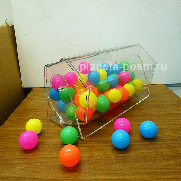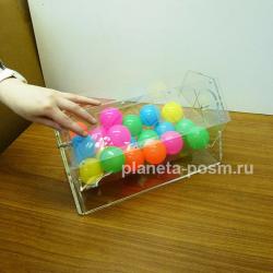 Барабан для розыгрыша имеет диаметр 20 см и длину 30 см, выполнен из пластика толщиной 2 мм. Лототрон комплектуется разноцветными шарами диаметром 30 мм в количестве 50 штук. Модель отличается компактностью, долговечностью и высокой прочностью.