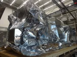 Металлизированная пленка защищает оборудование от внешних факторов. Материал характеризуется малой массой, высокой эластичностью и прочностью на разрыв, востребован для упаковки промышленного оборудования для консервации на время или транспортировки в сложных климатических условиях при множестве влияющих факторах.