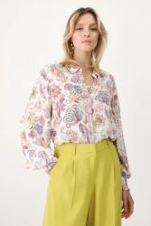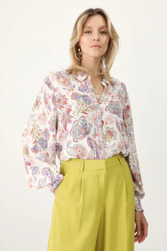 Рубашка свободного кроя из ткани с узором. С воротником. Свободный крой. Длинные рукава-фонарики. Ребристые манжеты. Дизайн с воротником. Застежка на пуговицы.