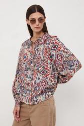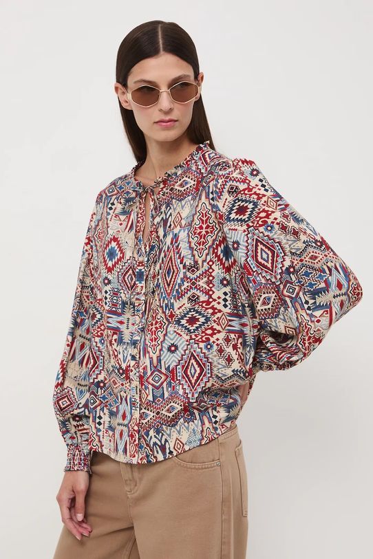 Блузка прямого кроя выполнена из узорчатой ткани и имеет заостренный вырез с завязкой.