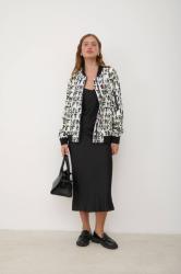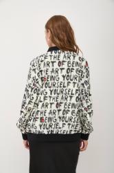 Куртка-бомбер женская фасона оверсайз, с застежкой на молнию и прорезными карманами. Модель с ярким узором мультиколор в стиле граффити, с трикотажной однотонной отделкой на вороте, по низу и на манжетах. Такая объемная куртка подарит максимальный комфорт, взяв на себя роль центра аутфита в стиле casual sport. Сочетайте ее с однотонной парой брюк или юбкой, носи с джинсами.