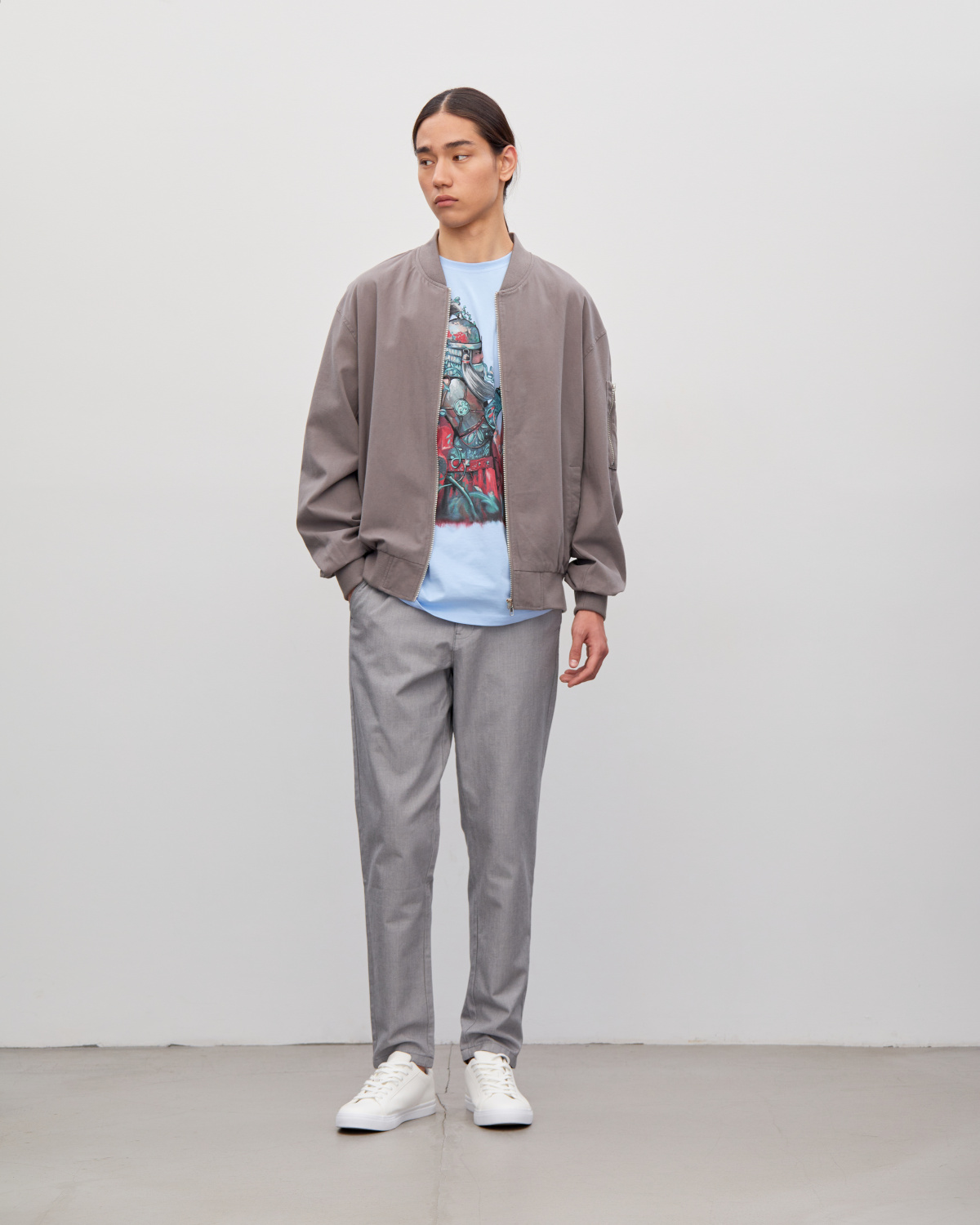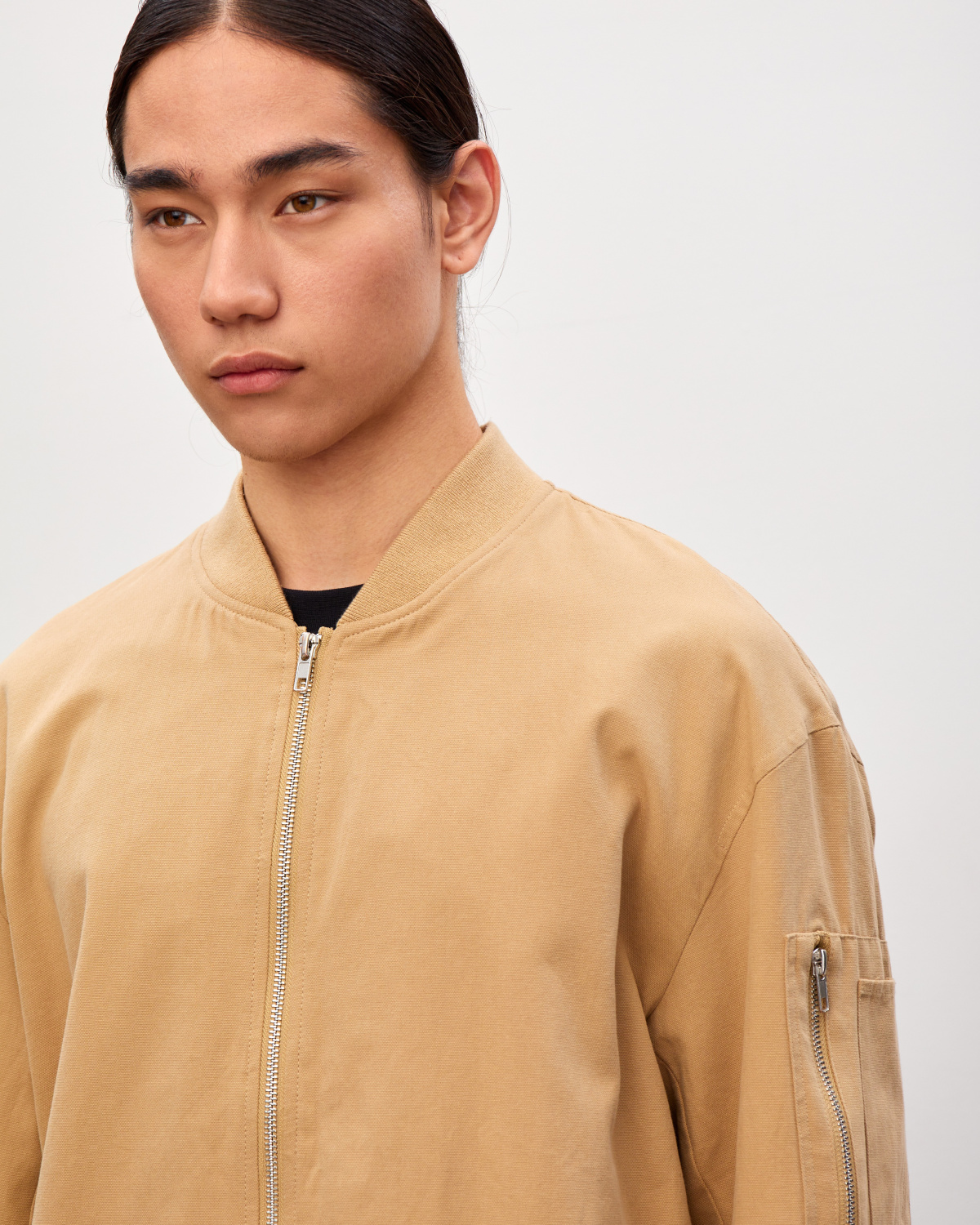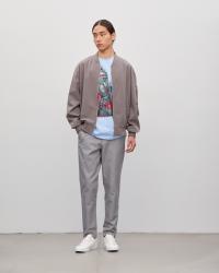 Куртка-бомбер мужская, фасона оверсайз, с застежкой на молнию. Прорезные карманы, объемные рукава, трикотажная отделка на вороте, манжетах и по низу. Модель однотонного цвета, с подкладом внутри. Такой бомбер станет отличным выбором для демисезонных аутфитов с динамичным характером, дополняя футболку и брюки или шорты, соседствуя с джинсами.