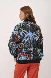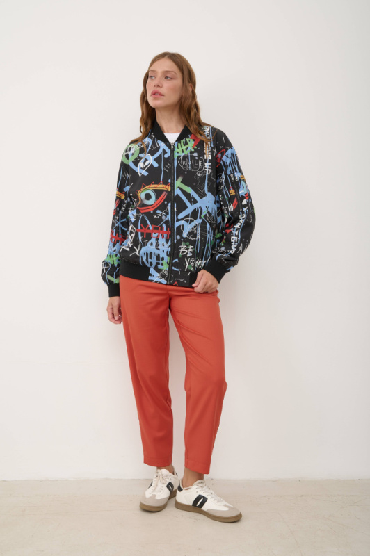 Куртка-бомбер женская фасона оверсайз, с застежкой на молнию и прорезными карманами. Модель с ярким узором мультиколор в стиле граффити, с трикотажной однотонной отделкой на вороте, по низу и на манжетах. Такая объемная куртка подарит максимальный комфорт, взяв на себя роль центра аутфита в стиле casual sport. Сочетайте ее с однотонной парой брюк или юбкой, носи с джинсами.