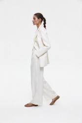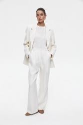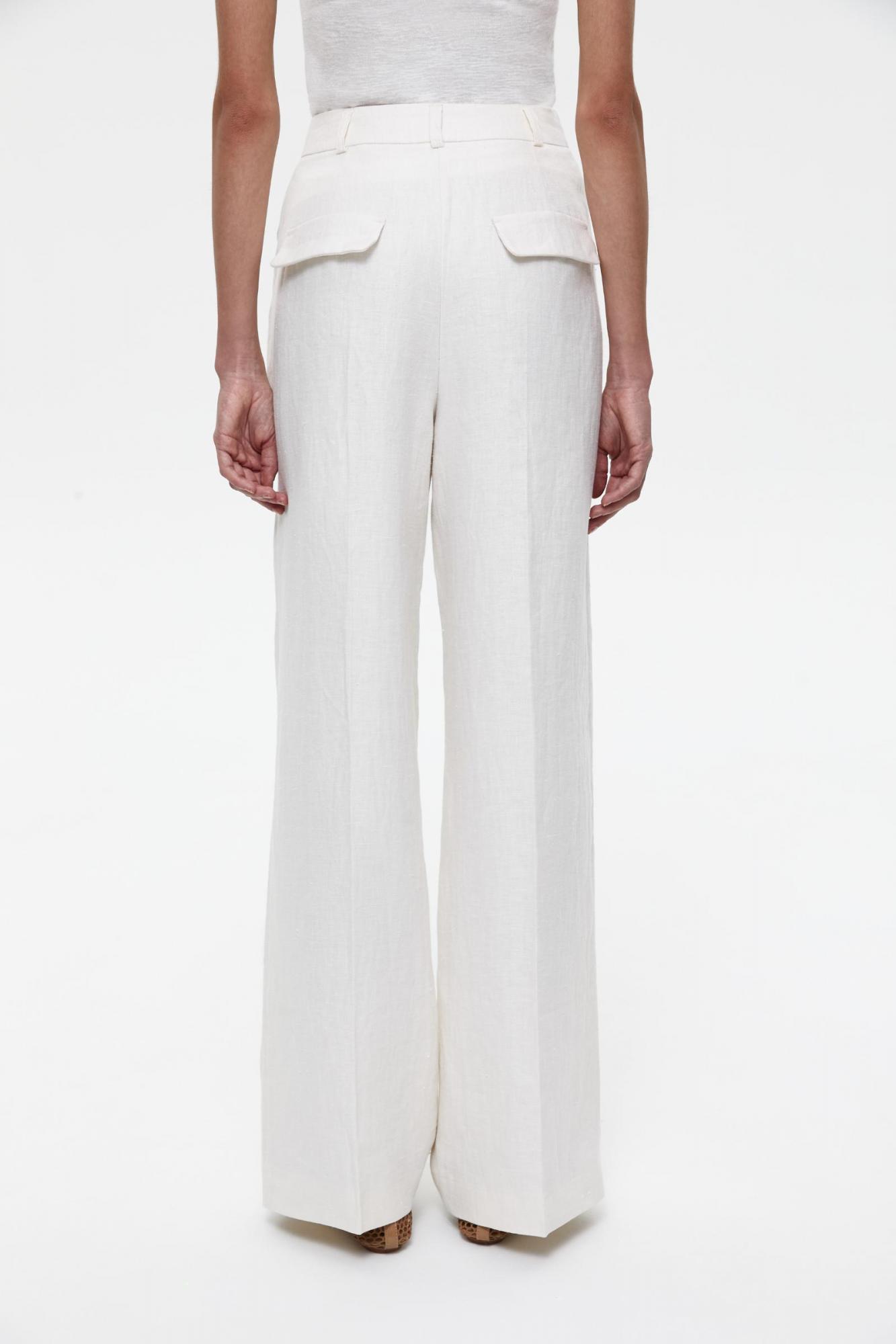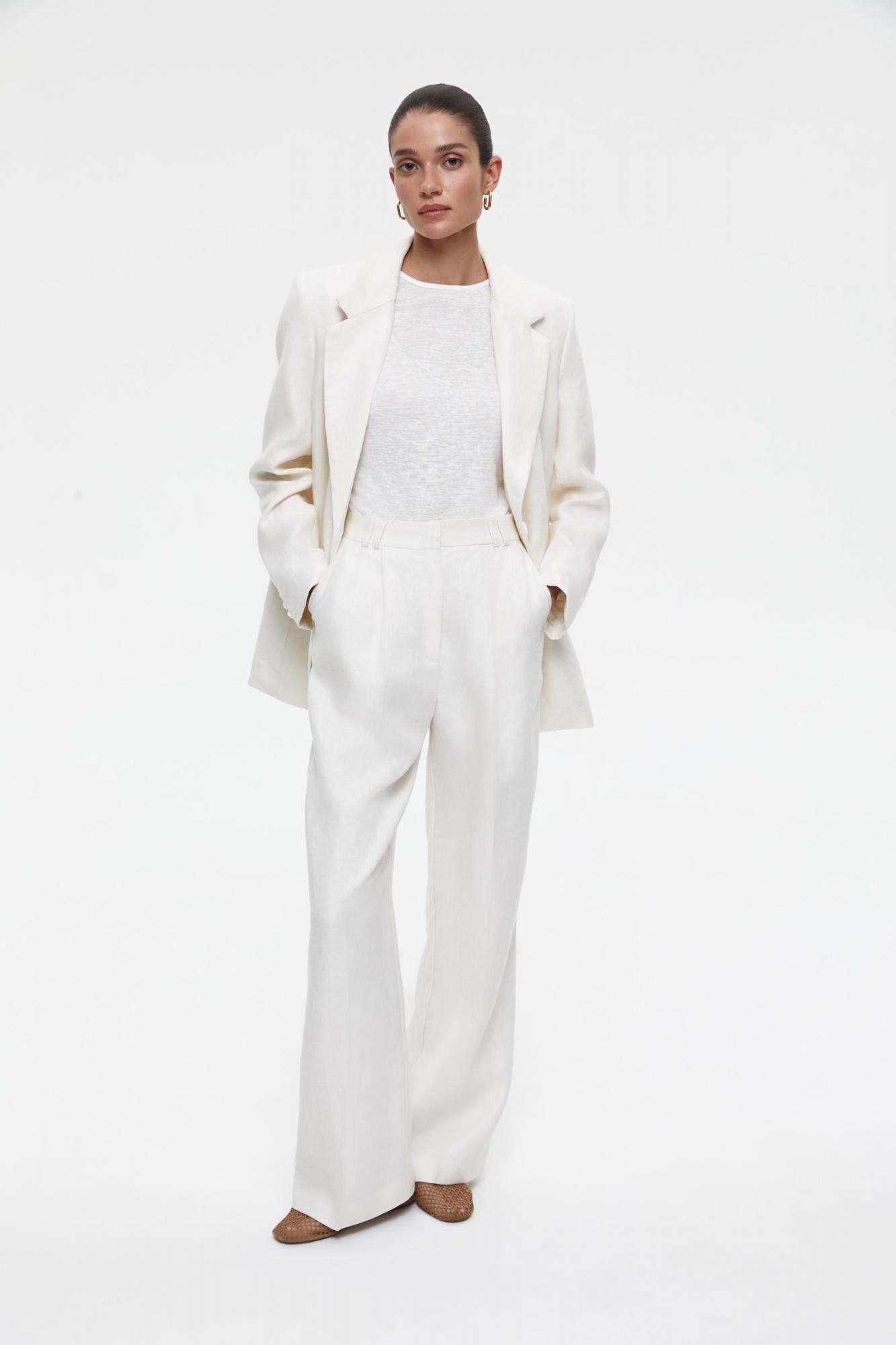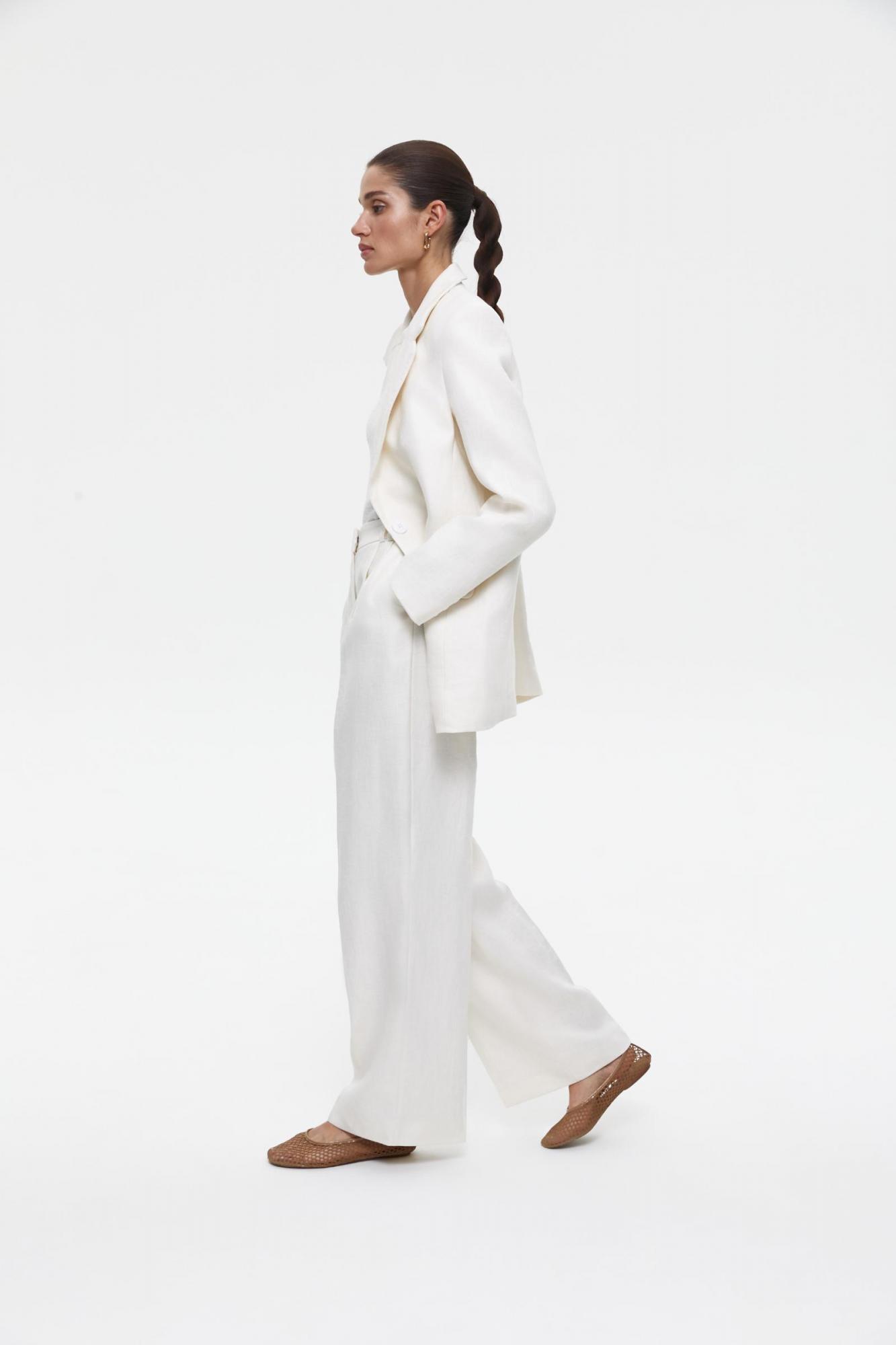 Широкие брюки из легкого льна. Модель выполнена с корсажным поясом для комфортной посадки на талии. Элегантный контраст создает нежная ткань с классическим силуэтом и стрелками, делая более расслабленную версию. Изделие дополнено декоративными отлетными клапанами сзади. Необходим бережный уход.