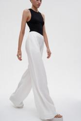 Брюки изо льна словно созданы для расслабленных и неторопливых выходов. Составьте комплект в рубашкой в тон, которую можно носить застегнутой или расстегнутой с топом-бандо. Легкие брюки, несмотря на их сезонность, можно продолжить носить и с наступлением осени, например, с поло с длинным рукавом или свитером, делая акцент на разных фактурах.