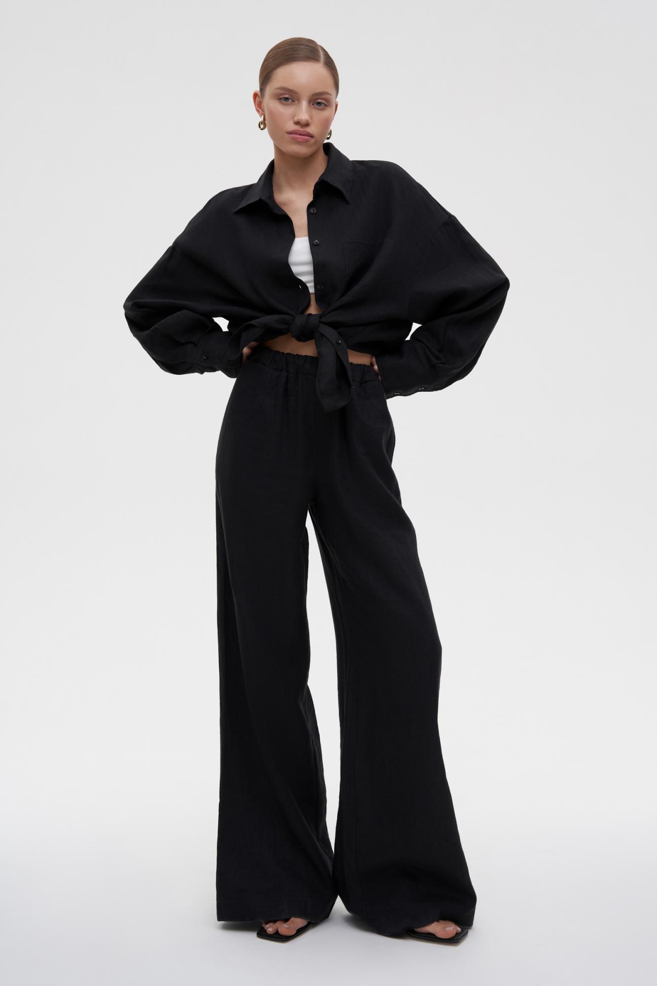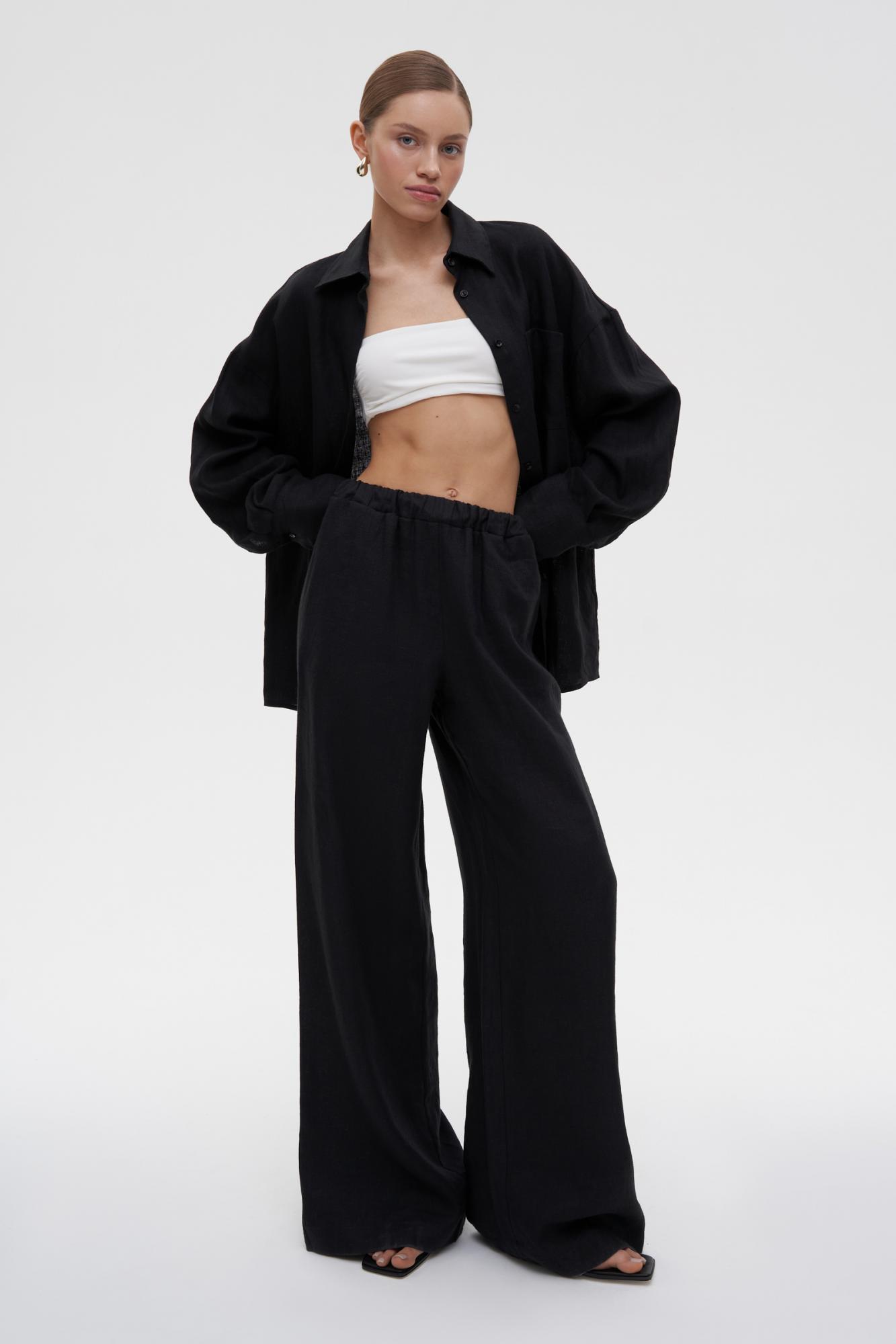 Брюки изо льна словно созданы для расслабленных и неторопливых выходов. Составьте комплект в рубашкой в тон, которую можно носить застегнутой или расстегнутой с топом-бандо. Легкие брюки, несмотря на их сезонность, можно продолжить носить и с наступлением осени, например, с поло с длинным рукавом или свитером, делая акцент на разных фактурах.