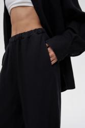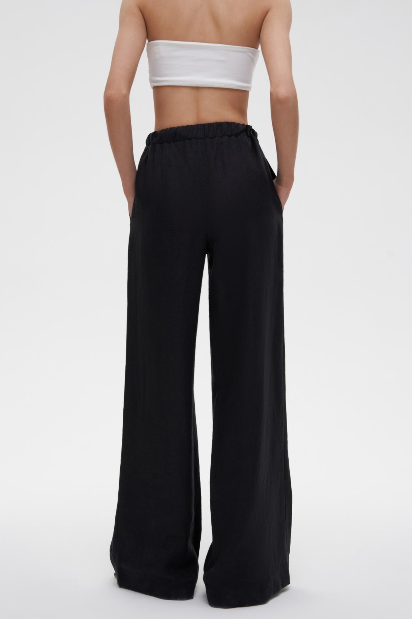 Длинные брюки изо льна свободного кроя. Модель выполнена на широкой резинке с высокой комфортной посадкой. Расклешенный и прямой силуэт создан для активных выходов, а легкая ткань приятна к телу и красиво струится по фигуре. Брюки имеют функциональные боковые карманы.