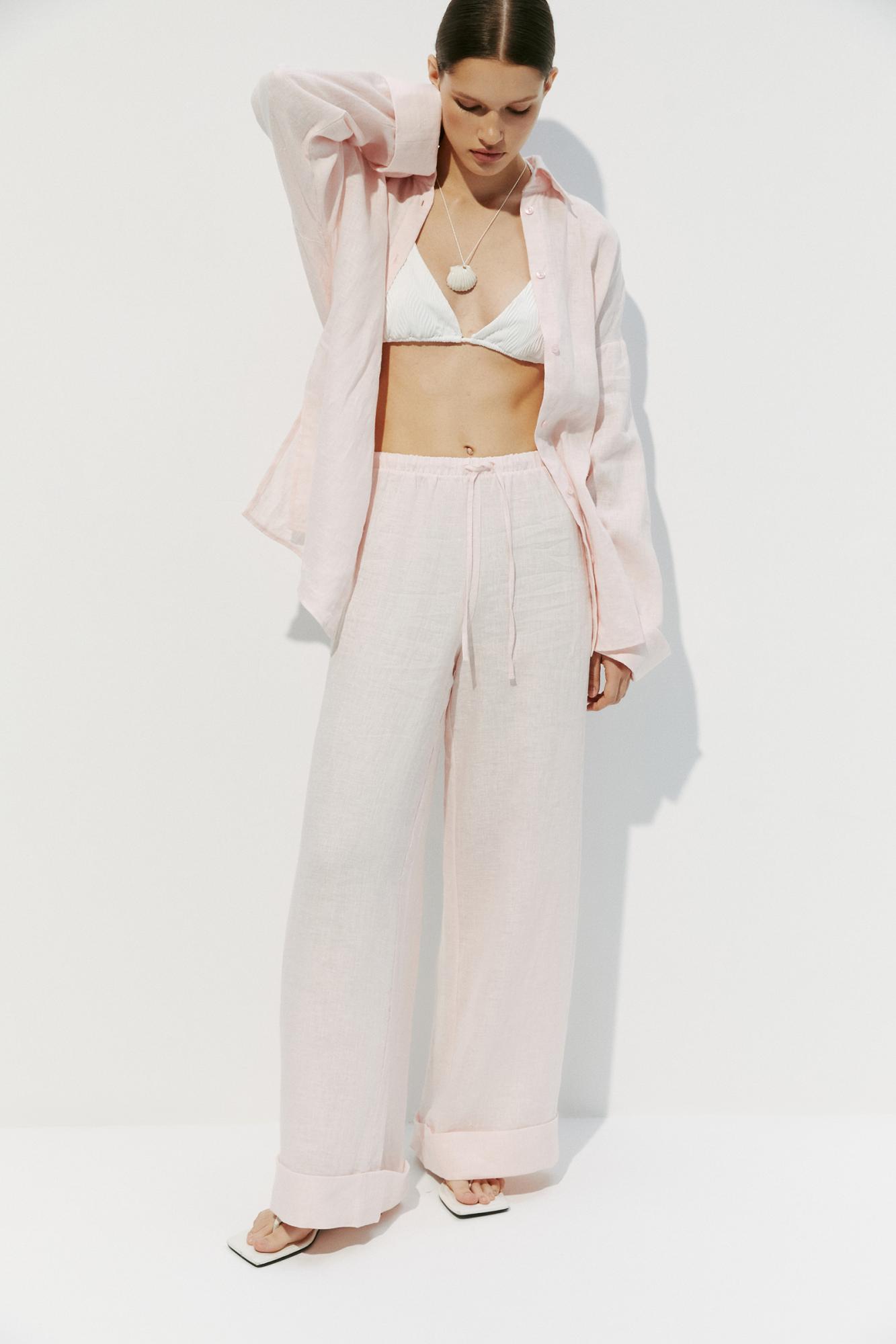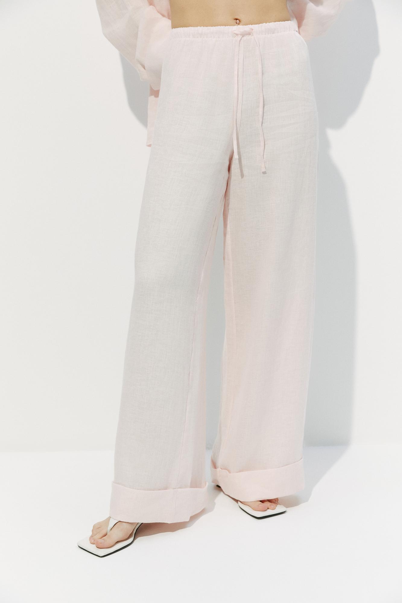 Брюки изо льна в свободном силуэте. Модель выполнена на комфортном поясе с резинкой с функциональной шнуровкой. Особенная деталь: высокие декоративные подвороты.