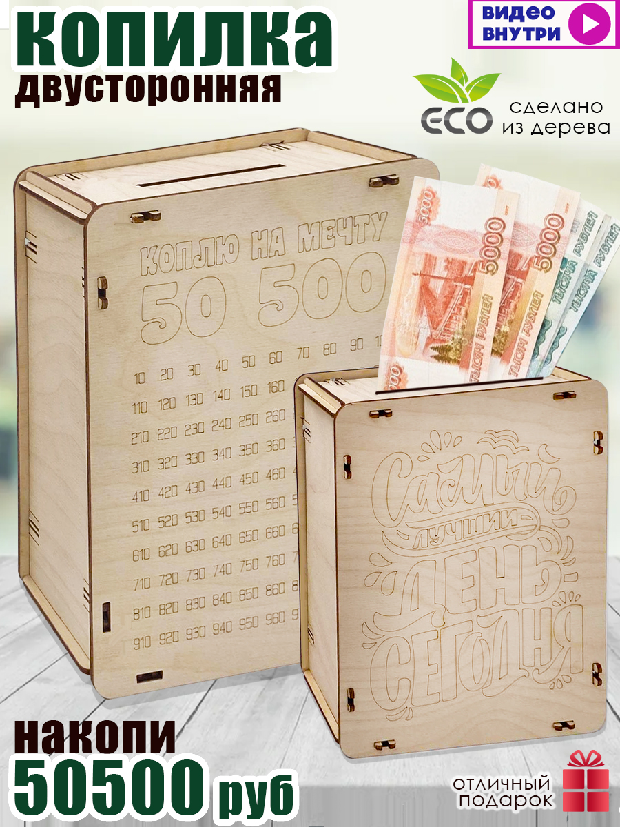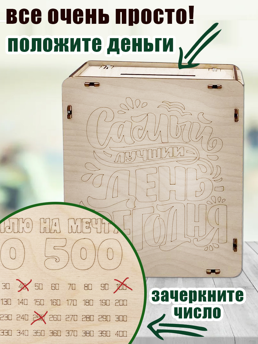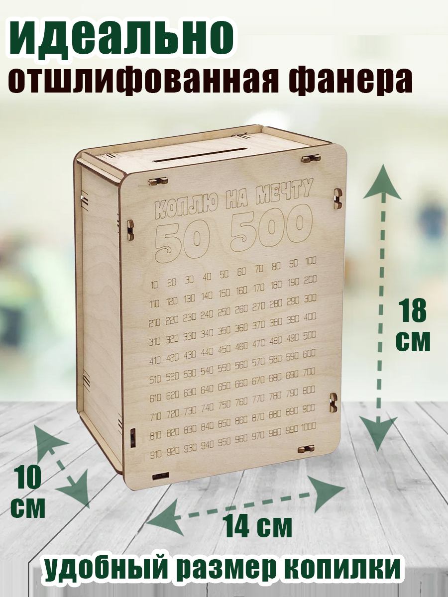 Копилка для денег. Копилка деревянная из березовой фанеры, с цифрами с обратной стороны — зачеркивайте сумму и копите! Копилка для монет и для бумажных денег, можно раскрасить, для этого подойдут фломастеры, краски или карандаши.