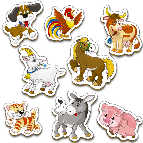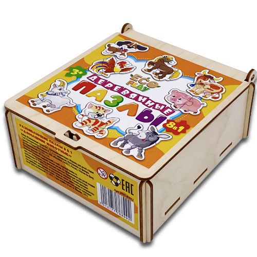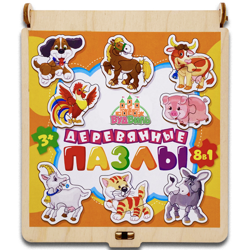 Набор пазлов из дерева для малышей "Домашние животные" 8 пазлов деревянные пазлы в красивом и практичном деревянном сундучке. 2,3,4,5,6 крупных элементов.