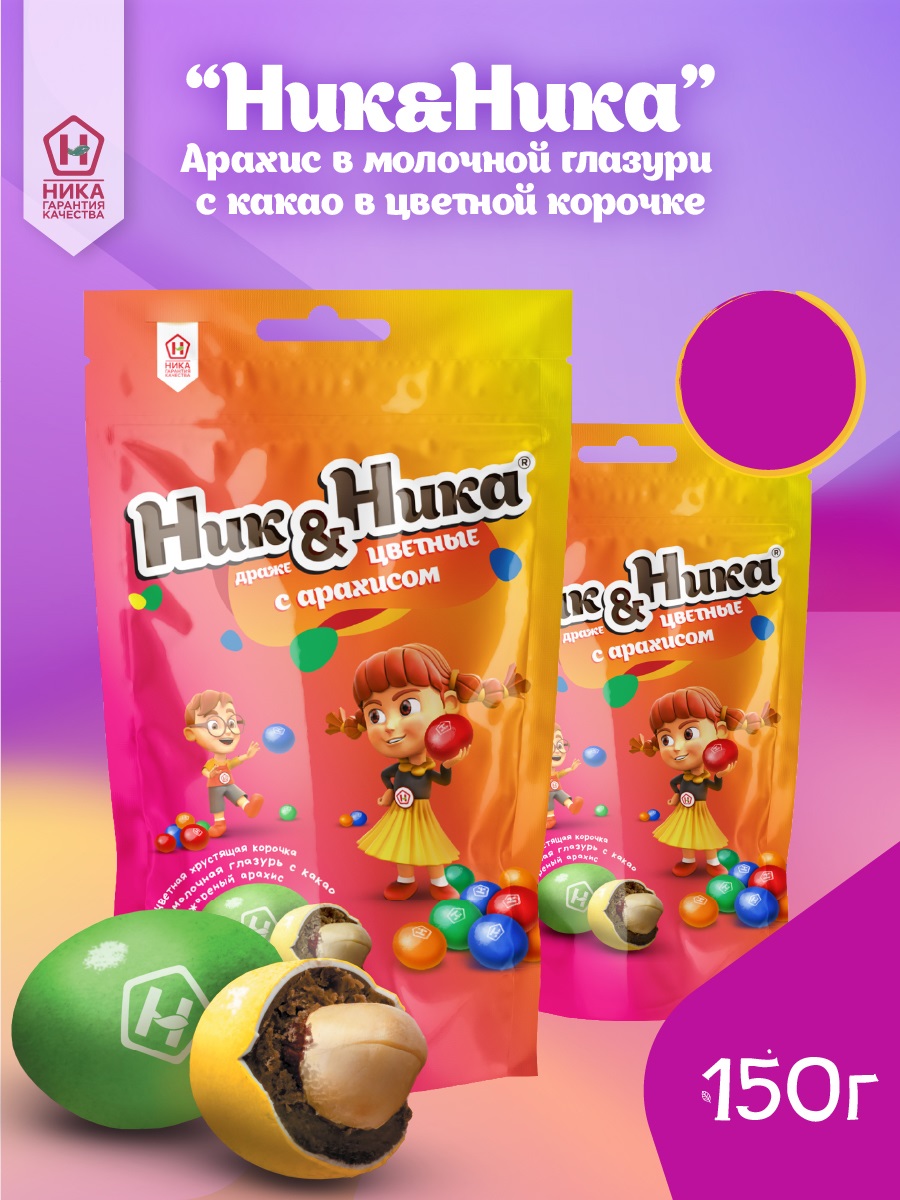 «НИК&НИКА» — аппетитное драже в хрустящей глазури. В линейке представлено несколько вариантов: - драже в пёстрой глазури с арахисом, с малиной и черникой - драже в шоколадной глазури с арахисом - драже в разноцветной глазури с арахисом