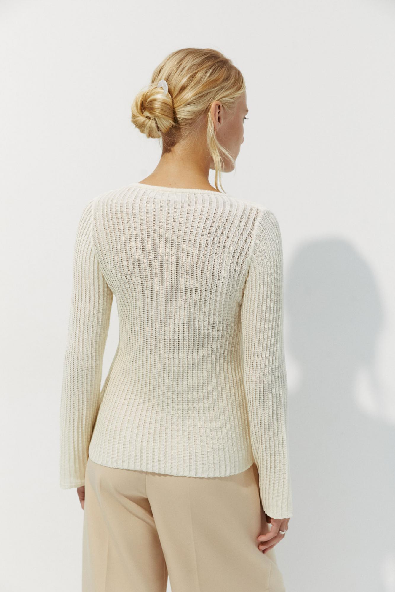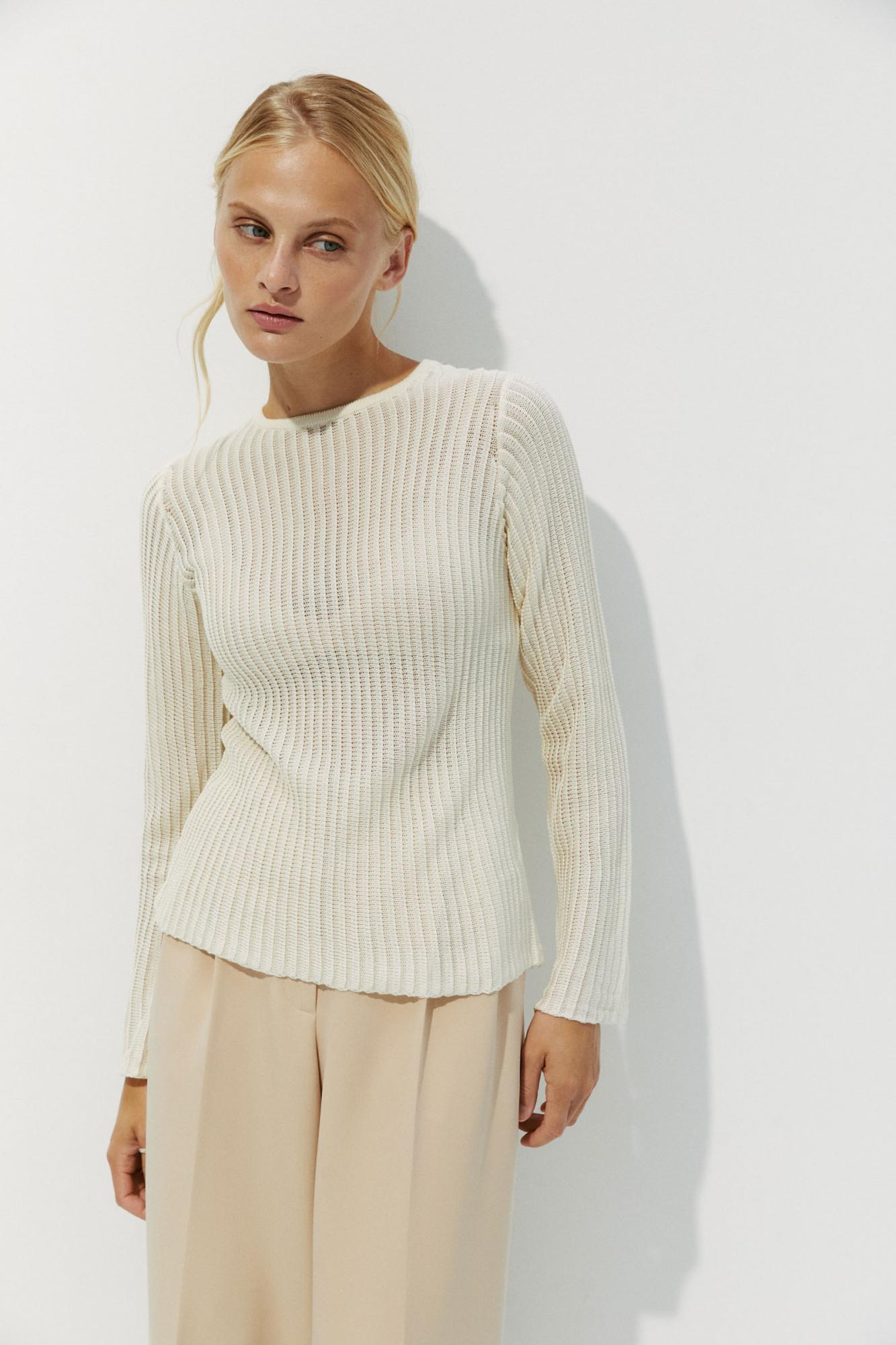 Полупрозрачный топ из фактурной ткани в вертикальную полоску. Модель красиво облегает фигуру и нежно спускается по линии талии. За комфорт в изделии отвечает вискозный трикотаж, круглая горловина и длинный рукав.