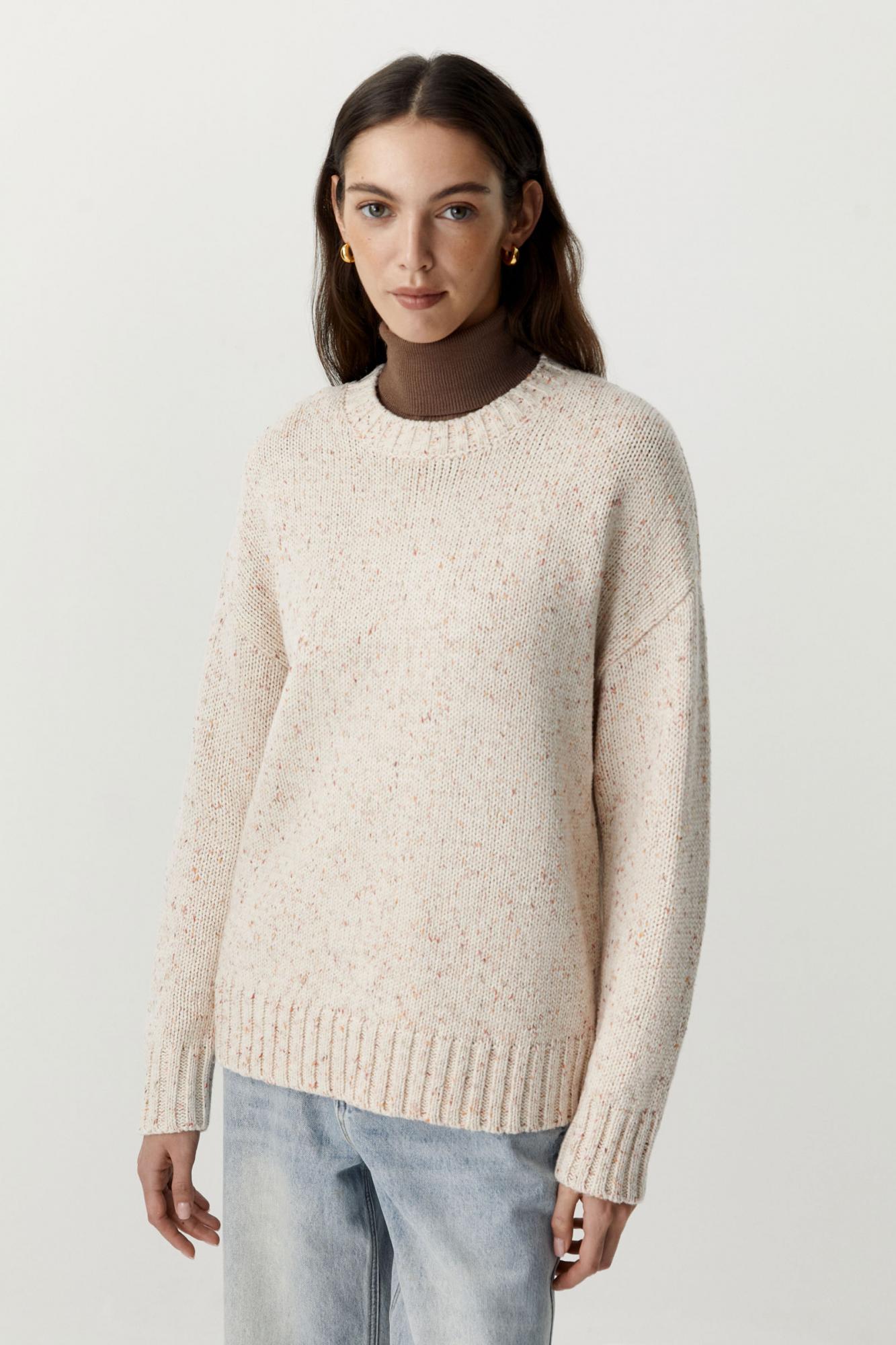 Джемпер вязаный из текстурной твидовой пряжи с добавлением шерсти - мастхэв сезона. Идеальную комфортную посадку обеспечивают свободный силуэт и круглая горловина. Изделие оформлено ластиками, во избежание деформации. Мягкая пряжа в крапинку не только красива внешне, но и приятна к телу.