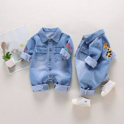 Стильный джинсовый комбинезон с длинными рукавами. Унисекс модель - подходит для мальчиков и девочек. Сверху и снизу застегивается на кнопочки, что позволяет свободно надевать его на малыша и быстро менять подгузник, не доставляя дискомфорта ребенку.