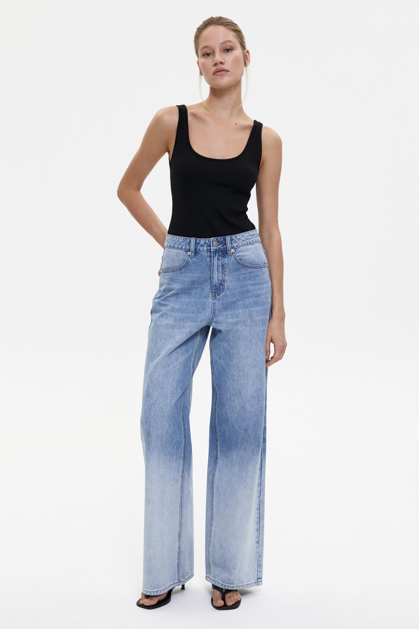 Джинсы в трендовой полной длине. Модель в широком прямом силуэте аккуратно "спускается" по линии бедер, благодаря чему не сковывает в движении и комфортна в носке. . Брюки имеют функциональные карманы и шлевки. Деним изделия выполнен с градиентом.