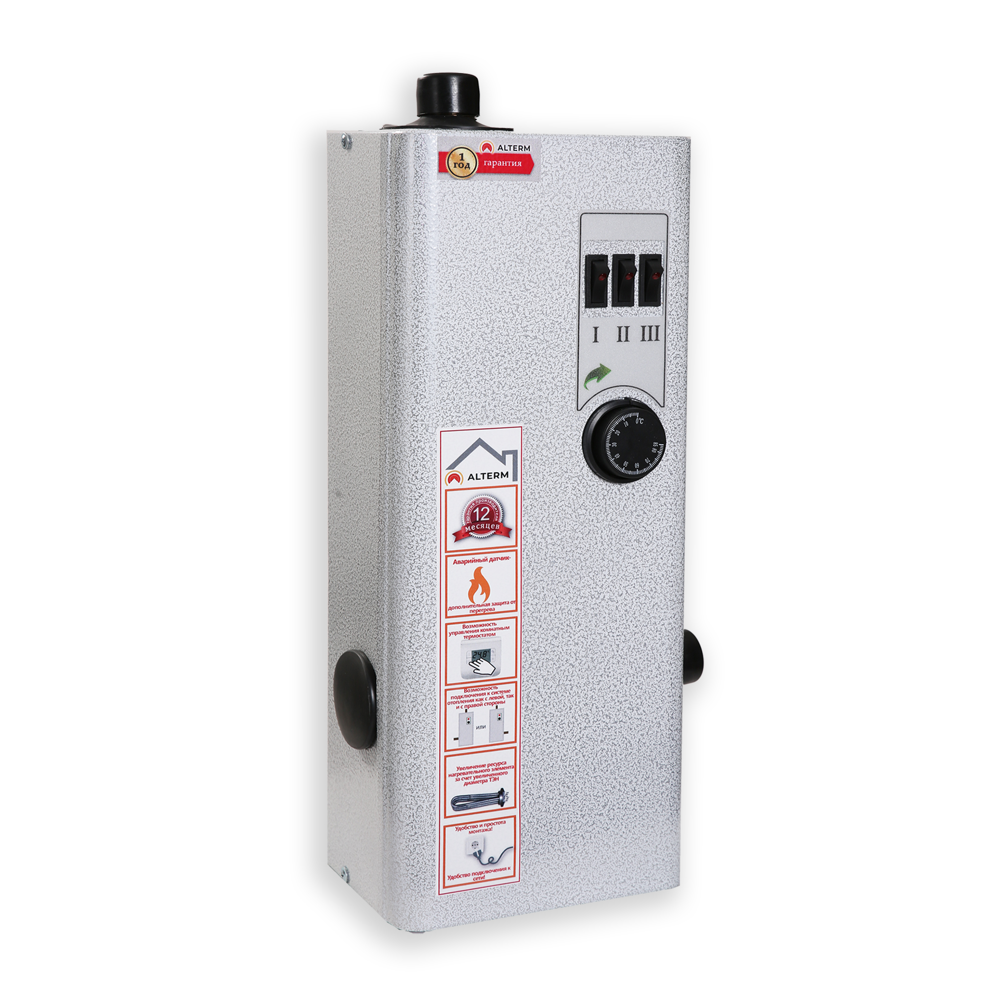 Для удобства эксплуатации электрокотёл оснащён встроенным датчиком температуры, который автоматически поддерживает нужный уровень нагрева в системе отопления. Дополнительно установлен аварийный датчик, отключающий блок ТЭН при угрозе закипания воды.