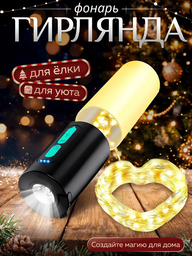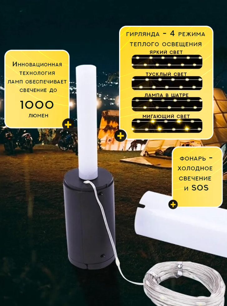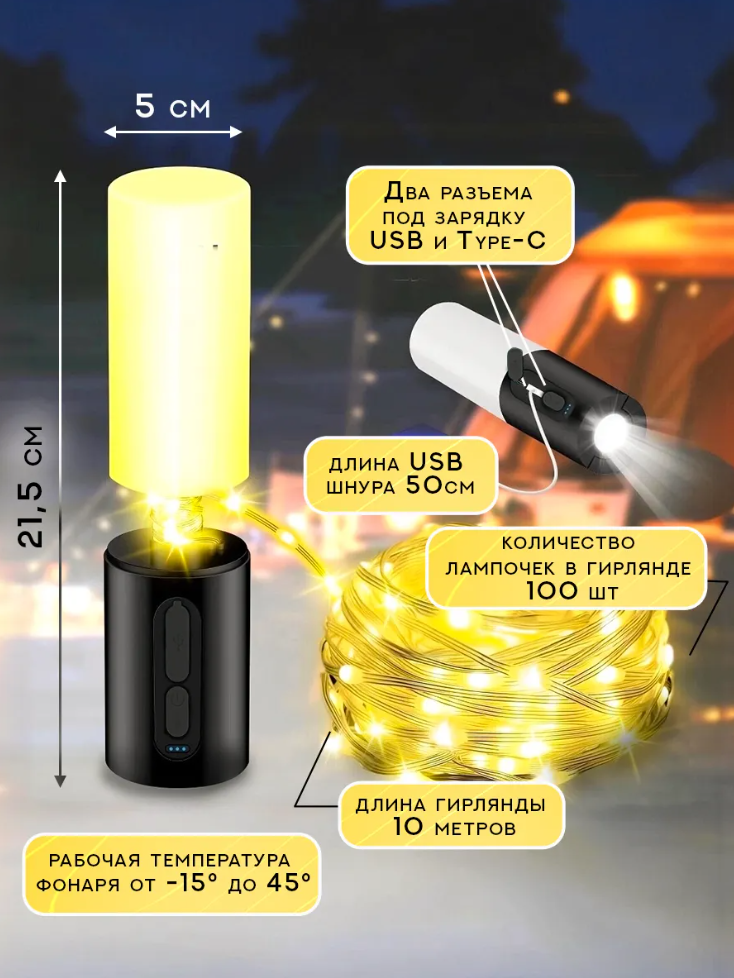 Светодиодный фонарь с гирляндой - идеальный выбор для кемпинга и туризма Универсальный фонарик аккумуляторный гарантирует яркое освещение в любых условиях. Подходит для похода, отдыха на природе и создания уютной атмосферы.