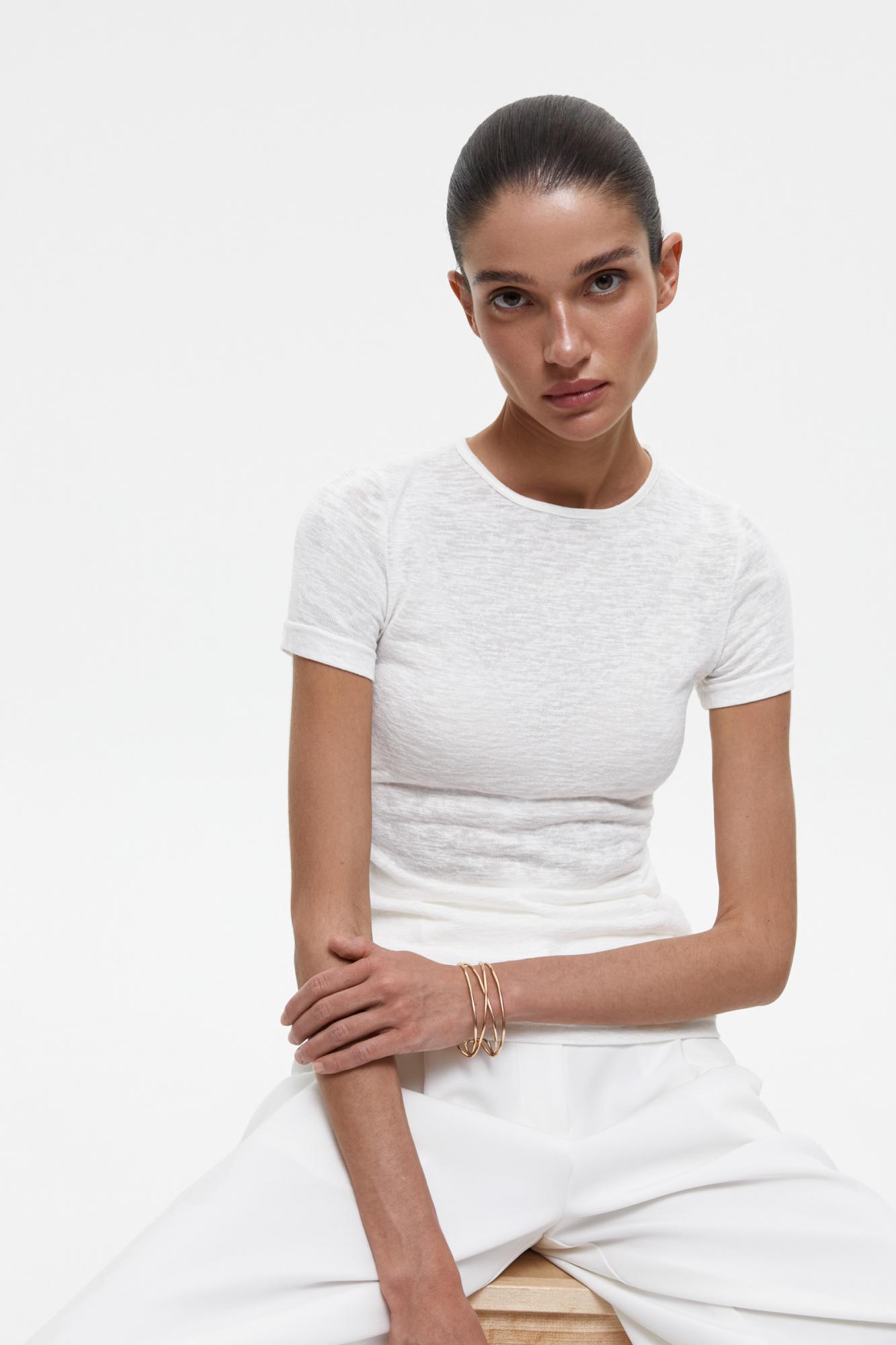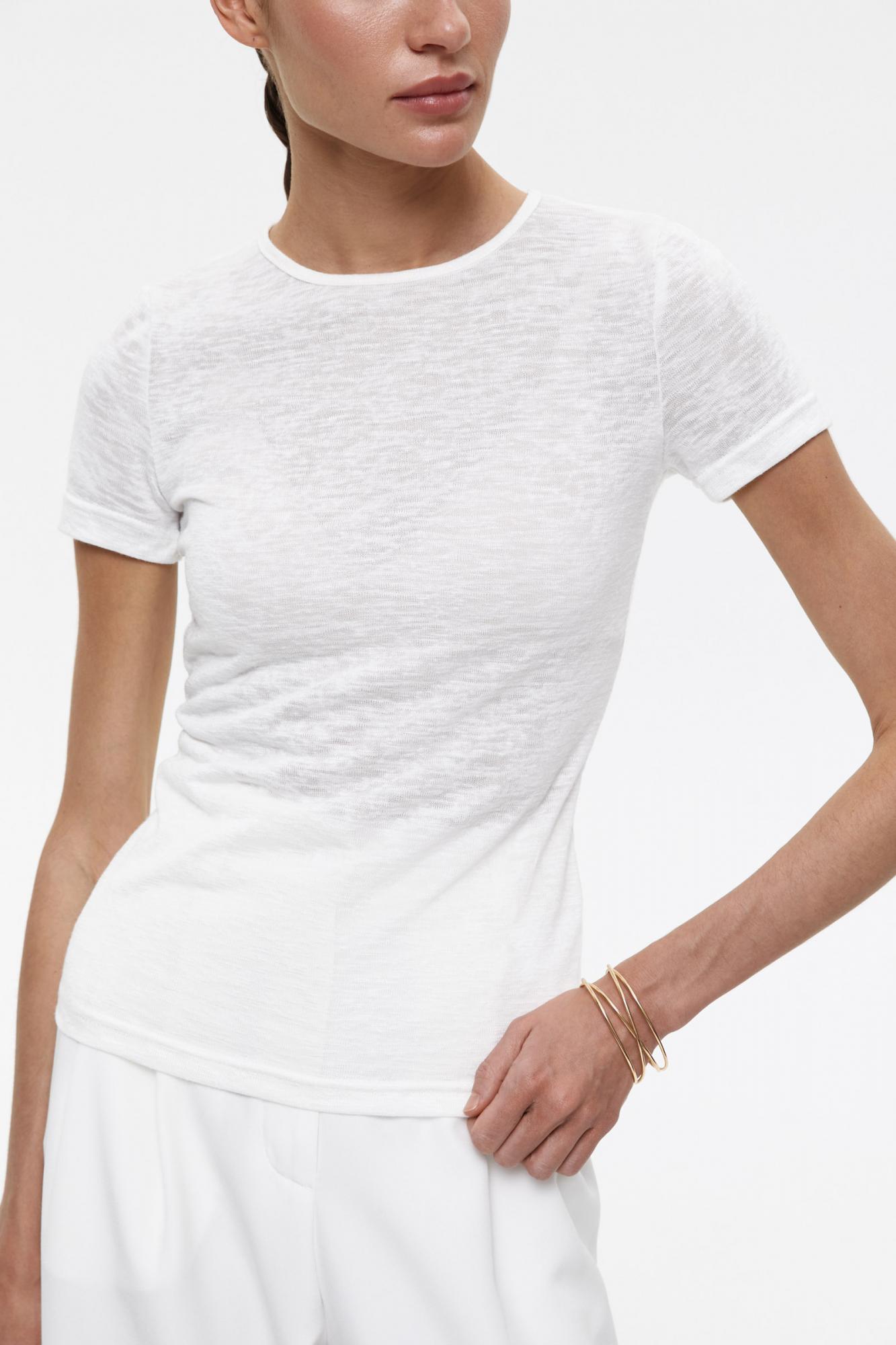 Прозрачная текстура изделия отлично подходит для трендовой многослойной стилизации. Носите с джинсами или классическими брюками. Впишите футболку в офисный дресс код с монохромной костюмной группой.