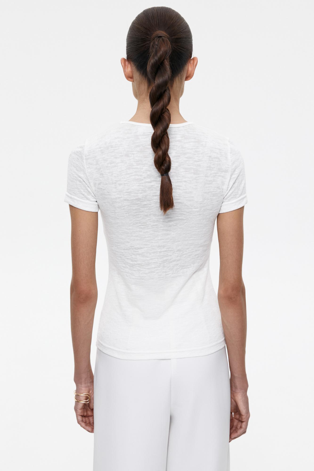 Футболка из полупрозрачного трикотажа, подчеркивающая линии фигуры. Модель выполнена в комфортном крое с коротким рукавом и круглой горловиной. Ткань изделия приятна и практически не ощущается на теле.