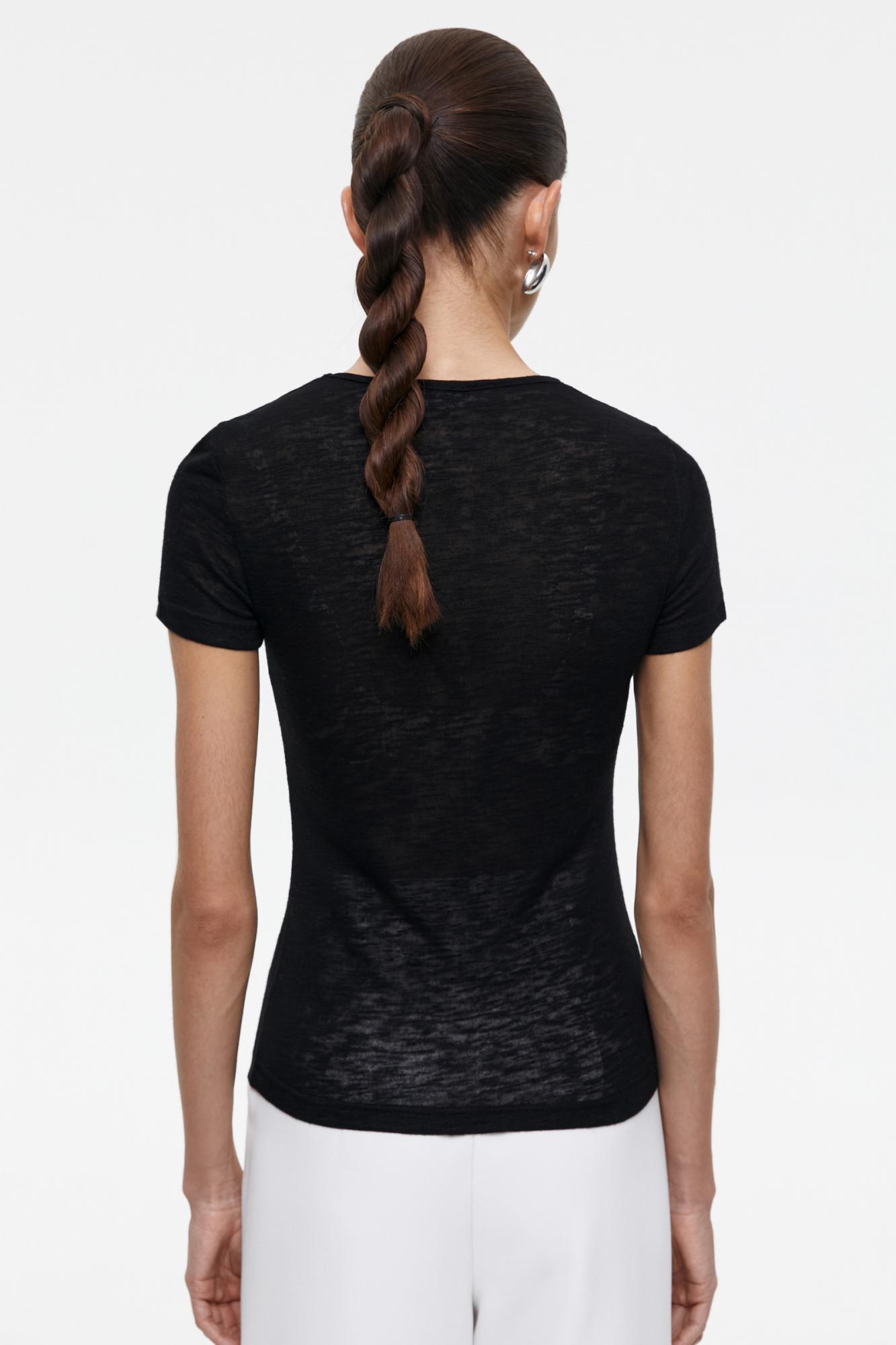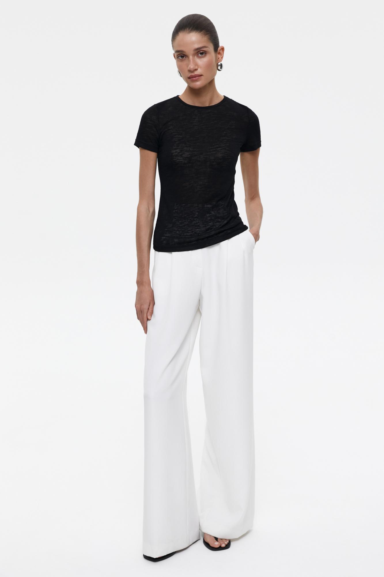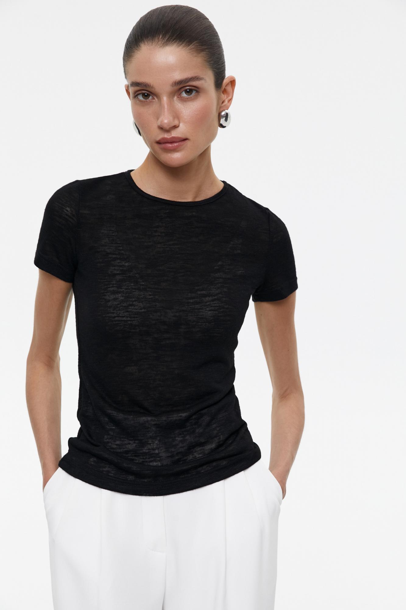Футболка из полупрозрачного трикотажа, подчеркивающая линии фигуры. Модель выполнена в комфортном крое с коротким рукавом и круглой горловиной. Ткань изделия приятна и практически не ощущается на теле.