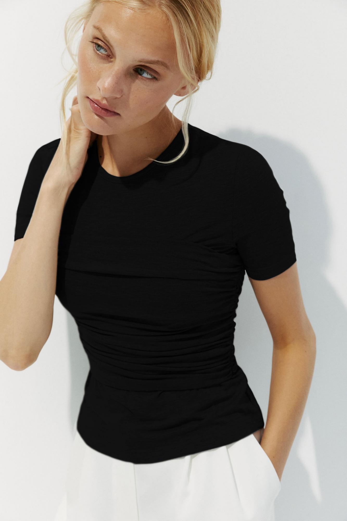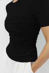 Футболка с рукавом 3/4 в облегающем силуэте. Комфорт в изделии обеспечивает правильная посадка и круглая горловина. Акцент модели –аккуратная драпировка, которая делает базовую модель более выразительной.