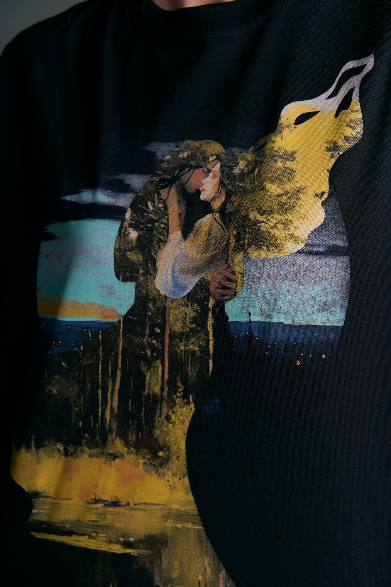 Футболка унисекс "Поцелуй": поэтичное слияние человека и природы. Принт представляет собой силуэт, сотканный из ночного леса, водной глади и влюбленной пары. Вдохновленный легендой Байкала и мотивами Куинджи и Шишкина, он передает гармонию и силу любви, где природа становится частью самого чувства. Это не просто одежда, а символ вечной связи и красоты.