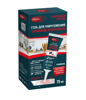 Гель для уничтожения тараканов и муравьев MG-G-006 - это высокоэффективное средство для борьбы с вредными насекомыми, которым не место в вашем доме! Средство так же помогает избавиться от рыжих муравьев в квартире и саду. Уникальная формула на основе действующего вещества фипронила (контактный и кишечный инсектицид широкого спектра действия) работает быстрее и защищает дольше. Состав геля позволяет эффективно уничтожить всю колонию насекомых: вызывает эпидемию среди тараканов и муравьев, уничтожает вредителей вместе с их потомством. Для применения наносите гелевое средство от бренда Ma Guse отдельными каплями на расстоянии 20-50 см друг от друга в местах обитания и передвижения насекомых. Распределяйте препарат - ликвидатор с мощным действием вдоль плинтусов и закапывайте в щели, наносите ловушку для ликвидации ползающих вредителей под батареи и под раковину в ванной комнате, возле труб водоснабжения в доме или квартире, за кухонным холодильником, шкафами и полками на кухне и в любой другой комнате. Рекомендуется наносить гель на подложки (в комплекте поставки). Принцип действия средства прост: таракан встречает гель на своем пути, съедает его и заражается, а затем направляется в колонию и заражает своих сородичей. Гибель насекомых происходит в течение 3-5 суток. Для обработки домашнего или дачного помещения площадью 15 кв.м вам понадобится 10-15 грамм геля. Концентрированный гель - уничтожитель - это настоящее оружие для избавления от незваных гостей в виде тараканов или муравьев. Быстродействующее профессиональное средство в тубе с большим объемом и экономичным расходом (75 мл) хорошо показывает свою эффективность, обеспечивает надежную защиту в течение длительного времени (не менее двух месяцев). Оно безопасно для домашних животных. В линейке бренда представлены ловушки против тараканов и муравьев, предложены серии Base и Clean, а также средство в шприце (30 мл). Произведено в России.