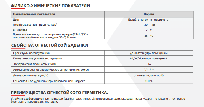 Герметик огнестойкий представляет собой высоковязкий однокомпонентный акриловый состав на водной основе. Белый цвет.