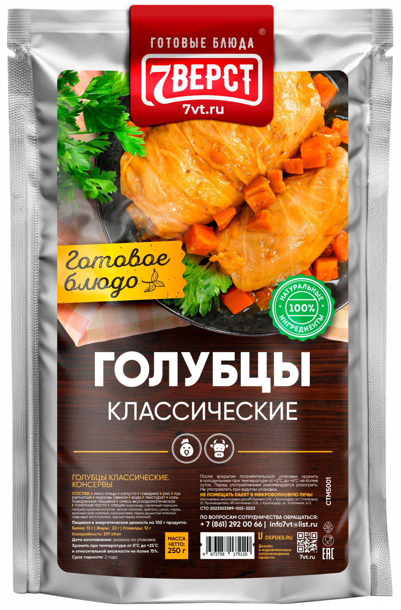 Мясо птицы, капуста, говядина, рис, лук репчатый, морковь свежая, вода, текстурат, соль поваренная пищевая, смесь вкусоароматическая, томатная паста, специи (кориандр, горчичный порошок, паприка красная молотая, чеснок молотый, орегано, сумах, перец красный чили молотый, мука рисовая, перец душистый молотый, лавровый лист молотый, черный перец молотый).