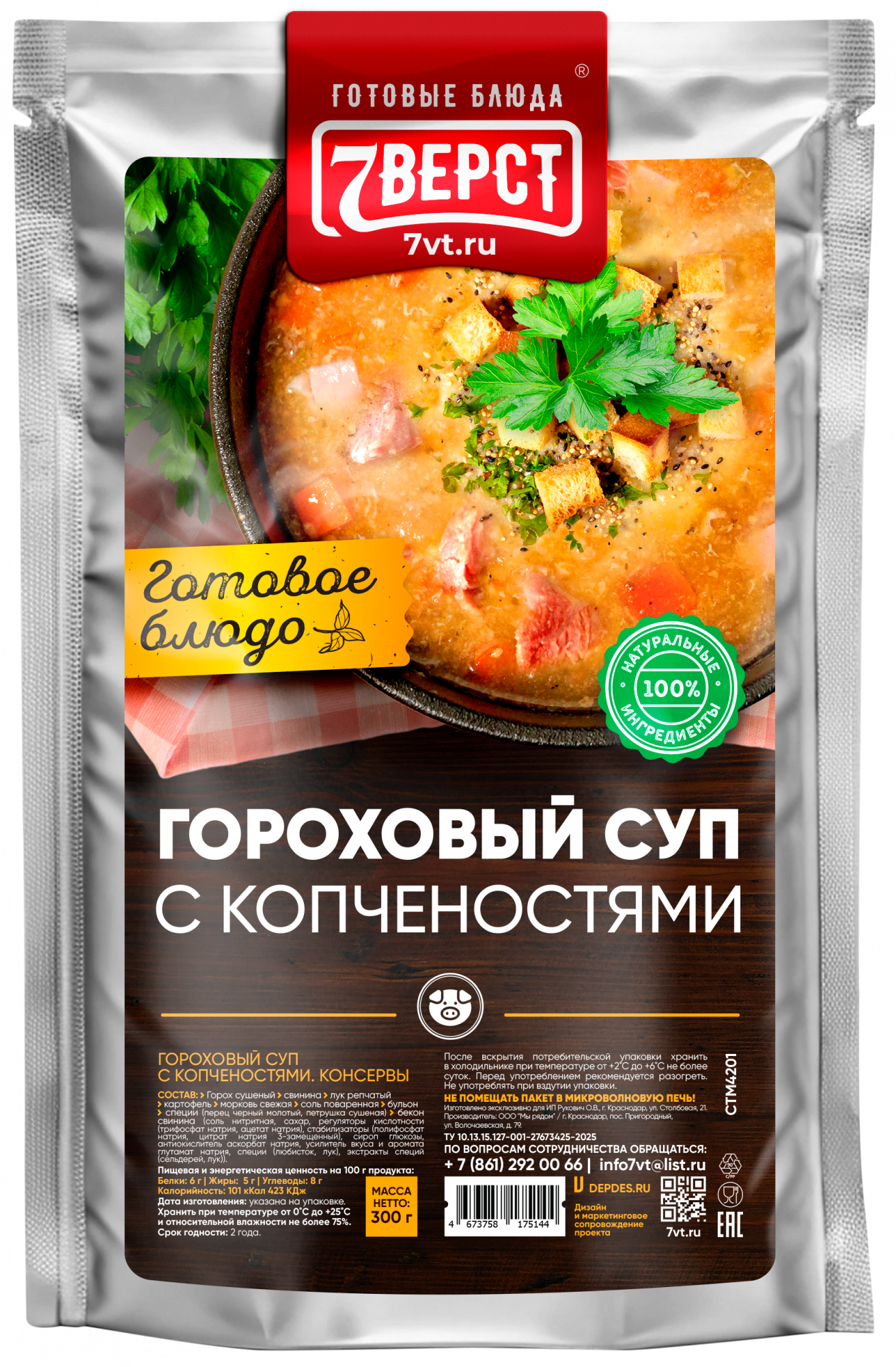 Горох сушеный, свинина, лук репчатый, картофель свежий, морковь свежая, соль поваренная, вода, специи ( перец черный молотый, петрушка сушеная), Бекон к/в (грудинка свиная, рассол (вода, соль, смесь посолочно-нитритная), экстракты пряностей (кориандр, можжевельник, лук порей), ароматизатор (ветчина и мясо), усилетель вкуса и аромата (глутамат натрия), сахар, декстроза, пищевой краситель (кармин).