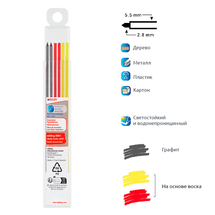 Комплект запасных грифелей edding 8881, подходящих для строительного карандаша для глубоких отверстий edding 8880. Набор из 6 грифелей разных цветов. Для нанесения точной маркировки в труднодоступных местах практически на все поверхности. Наносятся на шероховатые и гладкие поверхности, такие как древесина, пластмасса, картон, металл и плитка.