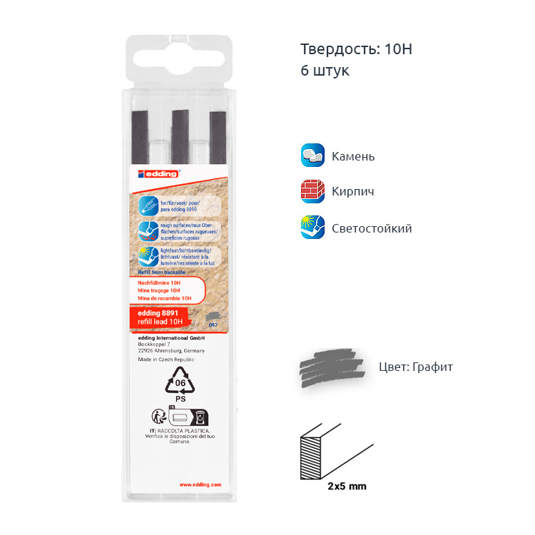 Запасные графитовые грифели edding 8891, твердость 10Н, подходят для автоматического строительного карандаша edding 8890. Набор из 6 запасных грифелей. Специальное решение для нанесения повседневной маркировки в столярном деле и ремесленном производстве.