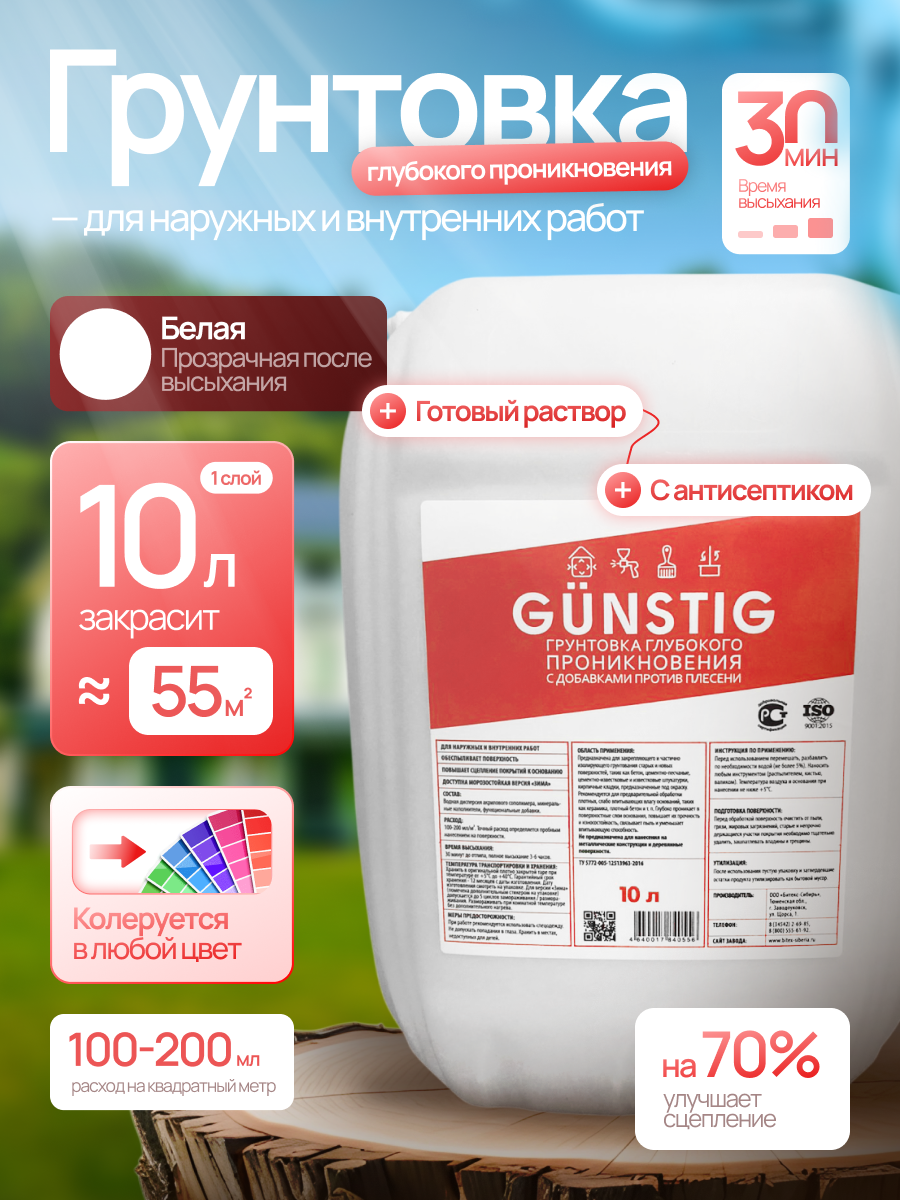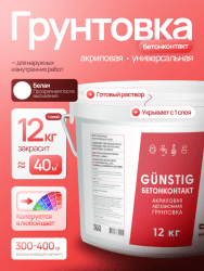Грунтовка акриловая глубокого проникновения для стен и потолков адгезионная 10 л Gunstig - это высококачественный продукт, предназначенный для внутренних и наружных работ.