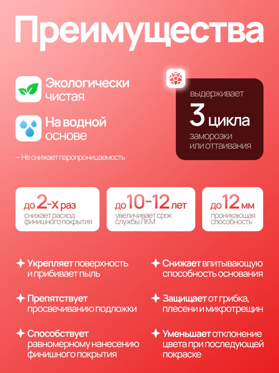 Грунтовка обладает рядом других полезных свойств. Она является антисептической, водостойкой, морозостойкой и противогрибковой. Это делает ее отличным выбором для защиты и укрепления различных поверхностей.