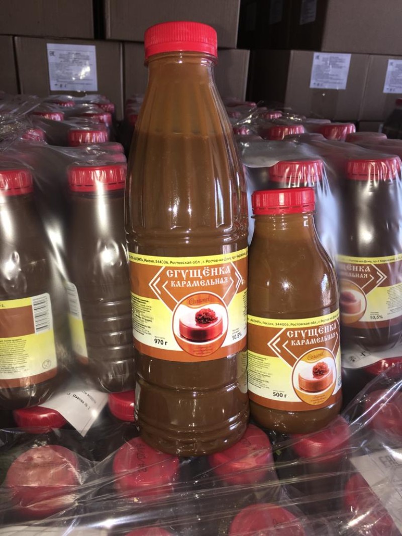 Консервы молокосодержащие сгущенные с сахаром "СГУЩЕНКА КАРАМЕЛЬНАЯ" с массовой долей жира 10,5%. Продукт произведен по ТУ 10.51.56-002-80376831-2017 и расфасовывается по ПЭТ бутылкам массой: 380/500/970/1000/1400/5000/6600г.