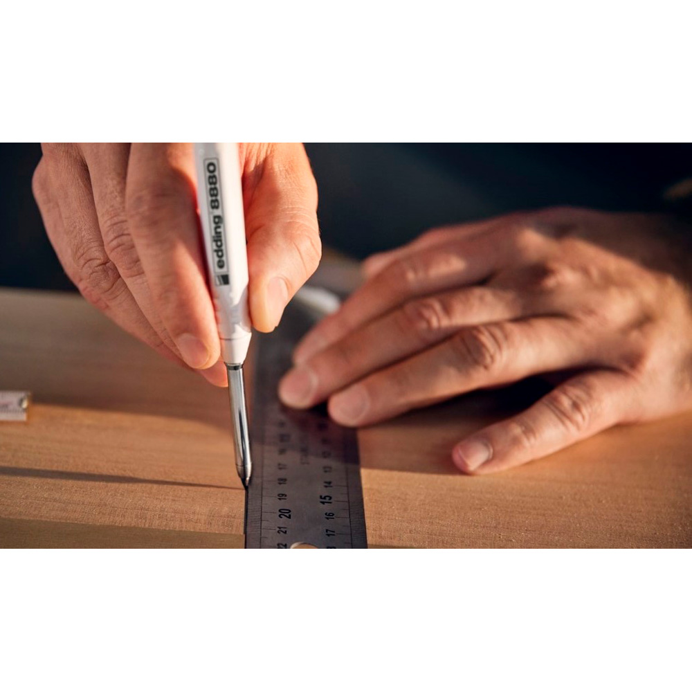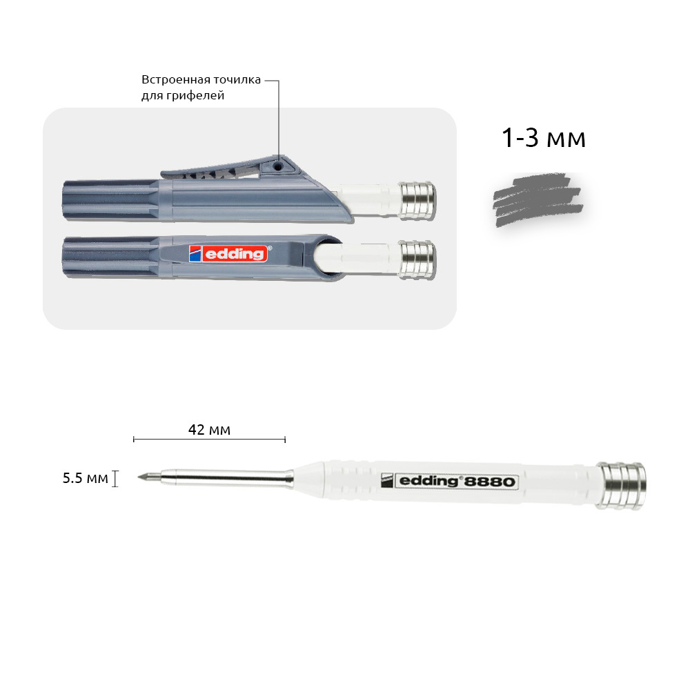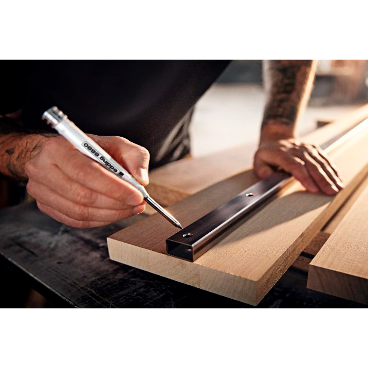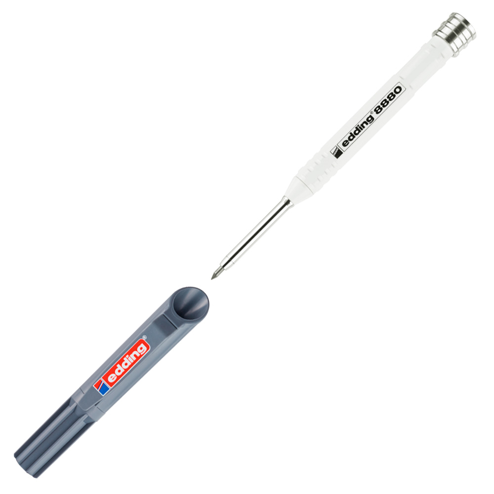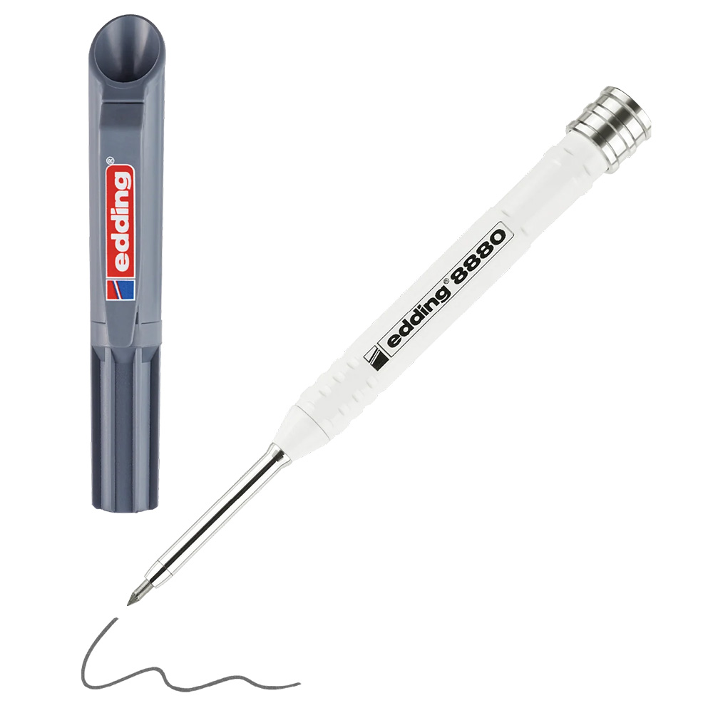 Строительный механический карандаш edding 8880 для глубоких отверстий в практичном чехле для нанесения точной маркировки практически на все материалы, такие как древесина, металл, пластмасса, плитка и картон. Сверхпрочный алюминиевый корпус. Длинный (42 мм) и тонкий (5.5 мм) кончик позволяет использовать карандаш даже в узких или других труднодоступных местах, например, в высверленных отверстиях или на срезанных кромках. Встроенная в чехол точилка для заточки одной рукой.