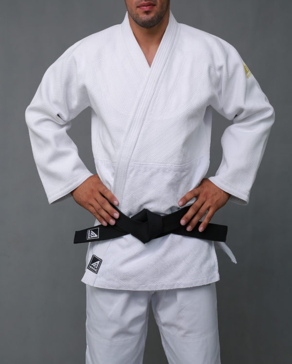 Места, подверженные наиболее интенсивному воздействию (лацканы, колени, проймы) усилены специальными вставками. Укрепленные плечи, цельнокроеный рукав, шов на спине и внутренние швы обшитые тесьмой. Тип плетения – рисовое зерно и ромбик. Отлично подходит для интенсивных тренировок. Выполнено с учетом всех базовых требований, выдвигающихся к кимоно для дзюдо.