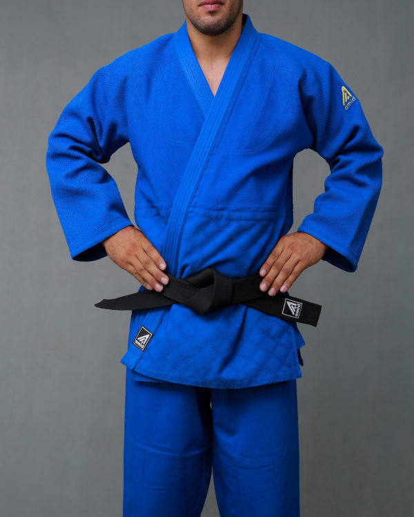 Места, подверженные наиболее интенсивному воздействию (лацканы, колени, проймы) усилены специальными вставками. Укрепленные плечи, цельнокроеный рукав, шов на спине и внутренние швы обшитые тесьмой. Тип плетения – рисовое зерно и ромбик. Отлично подходит для интенсивных тренировок. Выполнено с учетом всех базовых требований, выдвигающихся к кимоно для дзюдо.