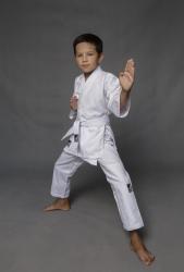 Куртка изготовлена из высококачественной хлопковой ткани плотностью 200 гр/м². Места, подверженные наиболее интенсивному воздействию (лацканы, проймы) усилены специальными вставками. Выполнено с учетом всех базовых требований, выдвигающихся к кимоно для карате.