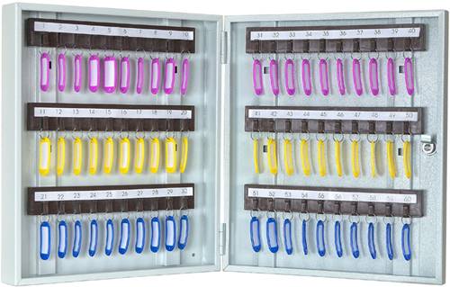 Ключница КЛ-60 предназначена для хранения 60 комплектов ключей. На задней стенке корпуса расположены отверстия для крепления. Ключница комплектуется 6 планками под навеску ключей. В дверь установлен замок типа «Cam-Lock».