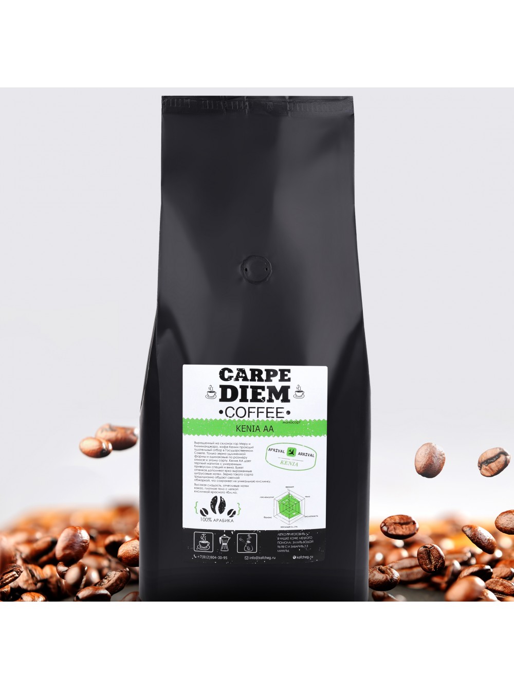 Выращенный на склонах гор Меру и Килиманджаро, кофе Кении проходит тщательный отбор в Государственном Совете. Только зерна удлиненной формы одинаковые по размеру относят к сорту АА. Столь строгая классификация выделяет сорт к элитному кофе высокого качества.Кения АА дает терпкий напиток с умеренным привкусом специй и вина. Букет оттенков дополняют фруктово-ягодные, выраженные цитрусовые нотки.Зерна такого сорта традиционно обдают светлой обжаркой, что сохраняет их уникальные характеристики кислинки.