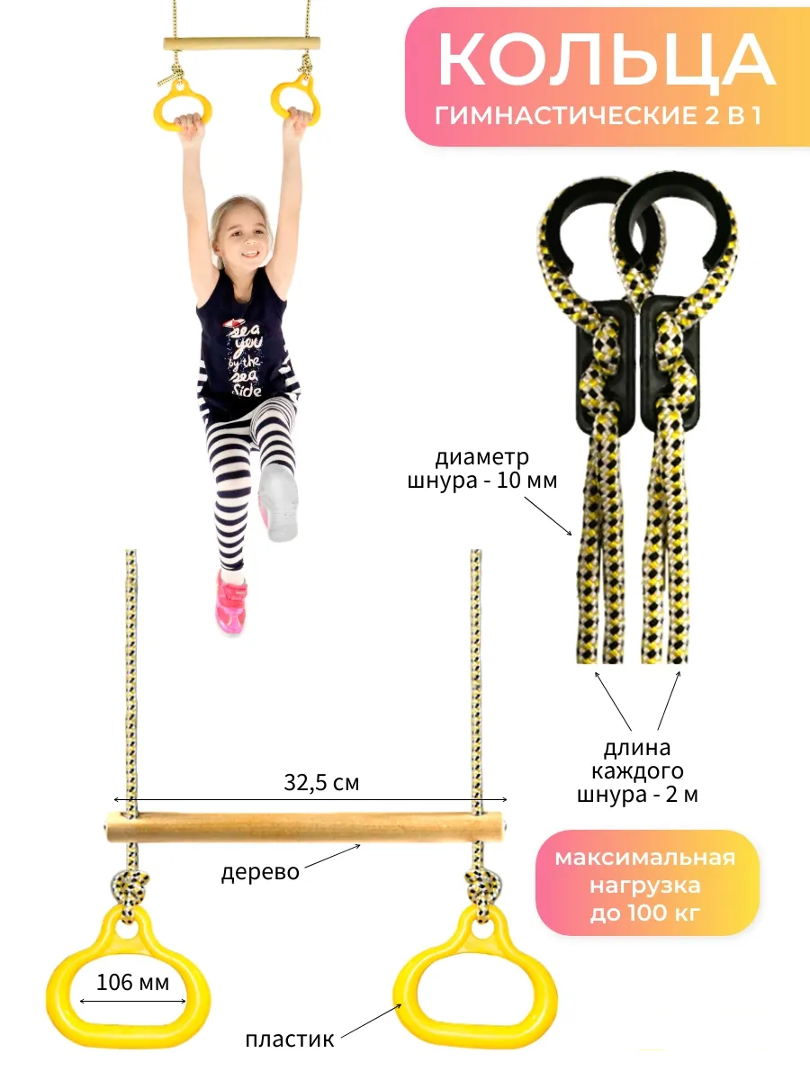 Яркий желтый цвет кольца привлекает внимание и способствует мотивации к регулярным тренировкам. Пластиковый материал кольца сочетает в себе прочность и комфорт, а деревянная перекладина обеспечивает надежную опору для выполнения различных упражнений. Размеры элементов продуманы для удобства детей, что помогает легко осваивать спортивные навыки и развивать физическую выносливость. Такой набор станет отличным дополнением к спортивному инвентарю и поможет сделать каждый тренинг эффективным и безопасным. Благодаря качественным материалам и функциональному дизайну, спортивный гимнастический комплект идеально подойдет как для начинающих, так и для продолжающих тренировки.