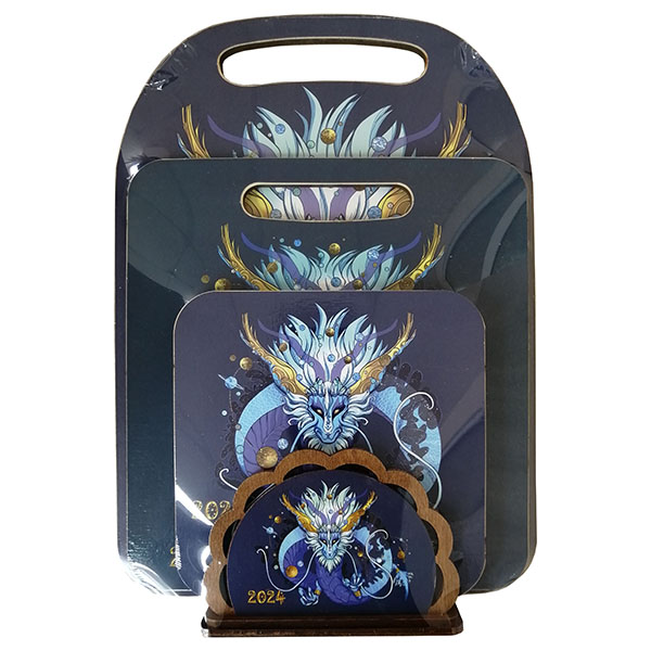 Набор: доска большая, доска малая, подставка под горячее 14 см, салфетница.