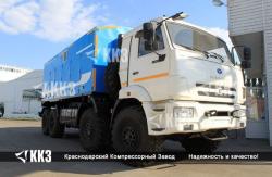 Воздушная компрессорная станция ТГА-18/101 на шасси проходимого грузового автомобиля для работы в нефтегазовой отрасли и для других применений. Давление - 100 кгс/см². Производительность - 18 Нм³/мин. - . Длина - 10000 см. Ширина - 2500 см. Высота - 3600 см. Вес - 25500 кг.