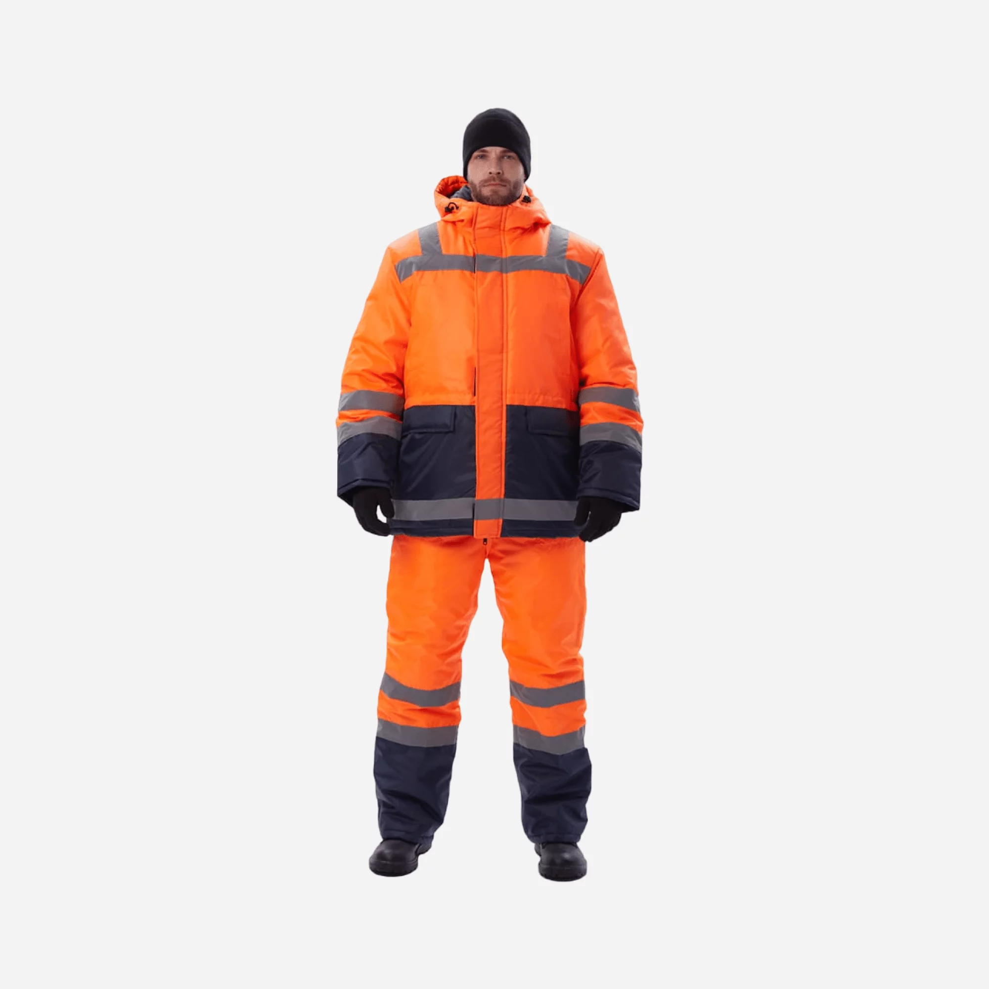 Костюм утепленный, состоит из удлинненной куртки с капюшоном и полукомбинезона.